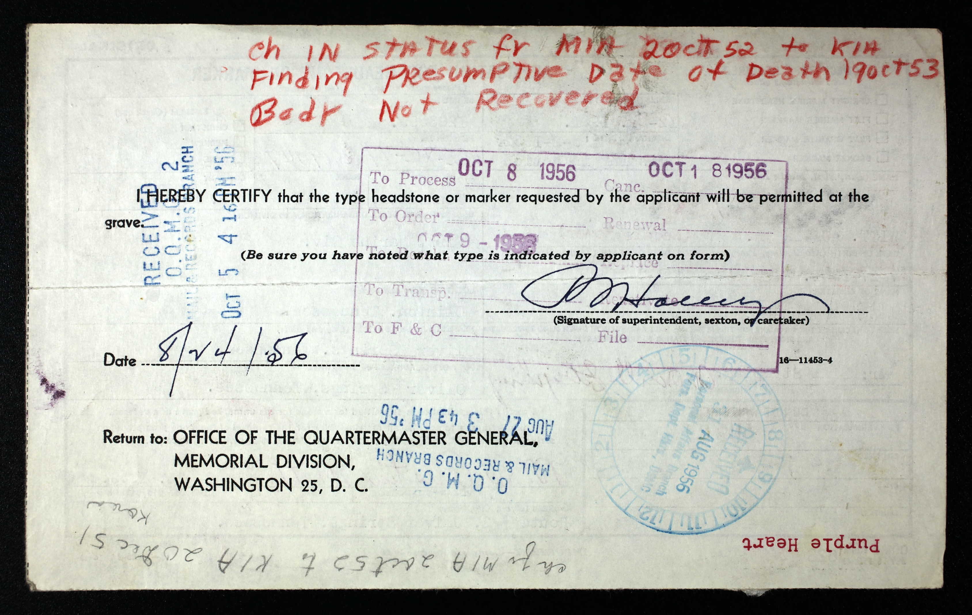 - Awards: Purple Heart, Combat Action Ribbon, Korean Service Medal, United Nations Service Medal, National Defense Service Medal, Korean Presidential Unit Citation, and Republic of Korea War Service Medal