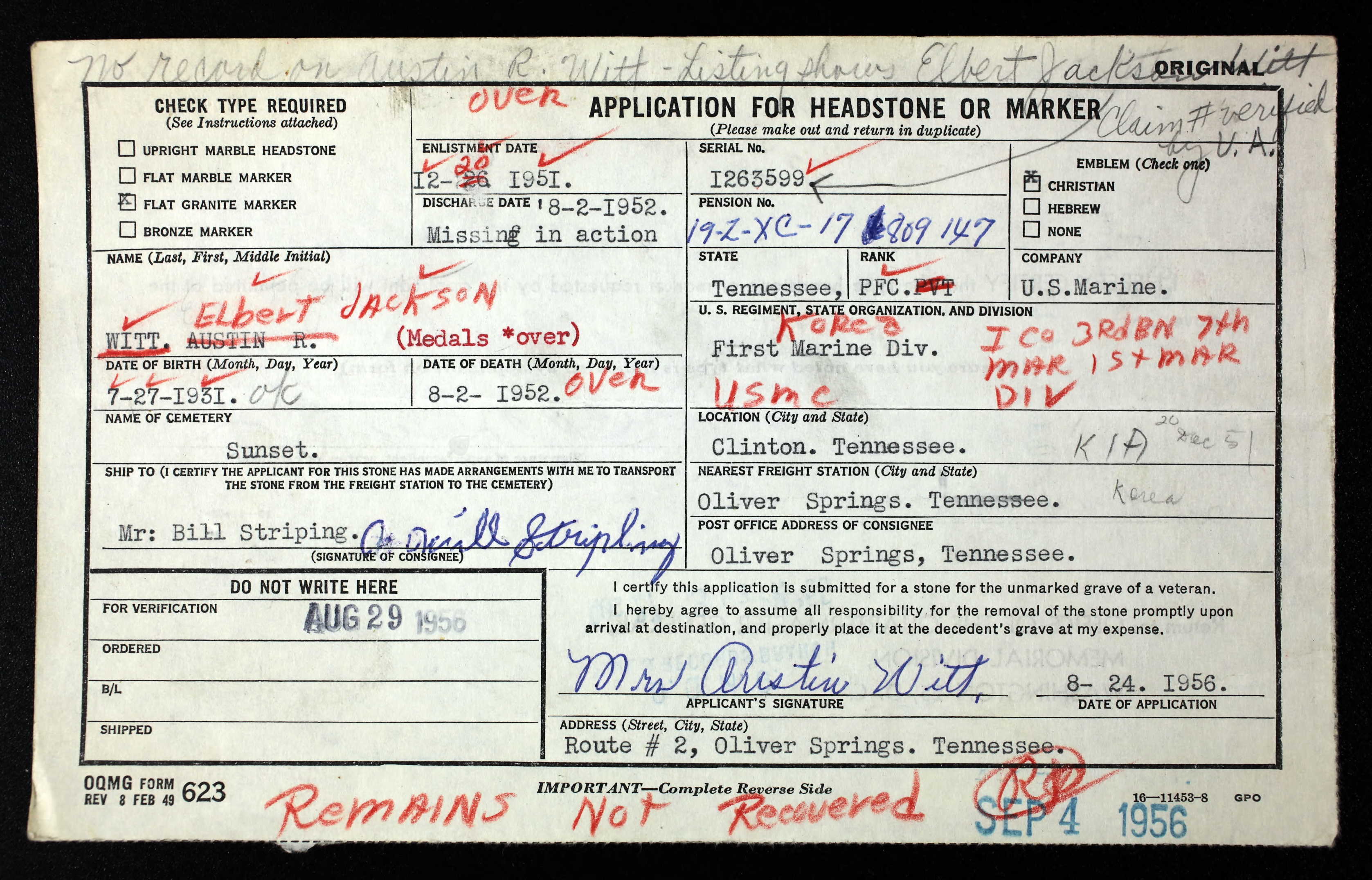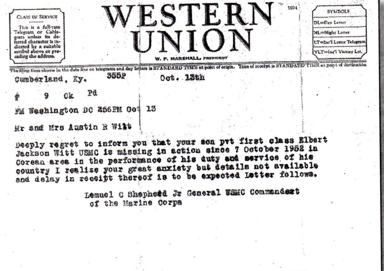 Witt joined the Marine Corps and after basic training was sent to the front lines in Korea. Only nine months later his family received notification that he was missing in action and presumed dead on October 7, 1952. He was in the company of two other soldiers when they were captured or otherwise encountered enemy fire and he was separated from his fellow soldiers. In the 64 years since he went missing his body has yet to be recovered.