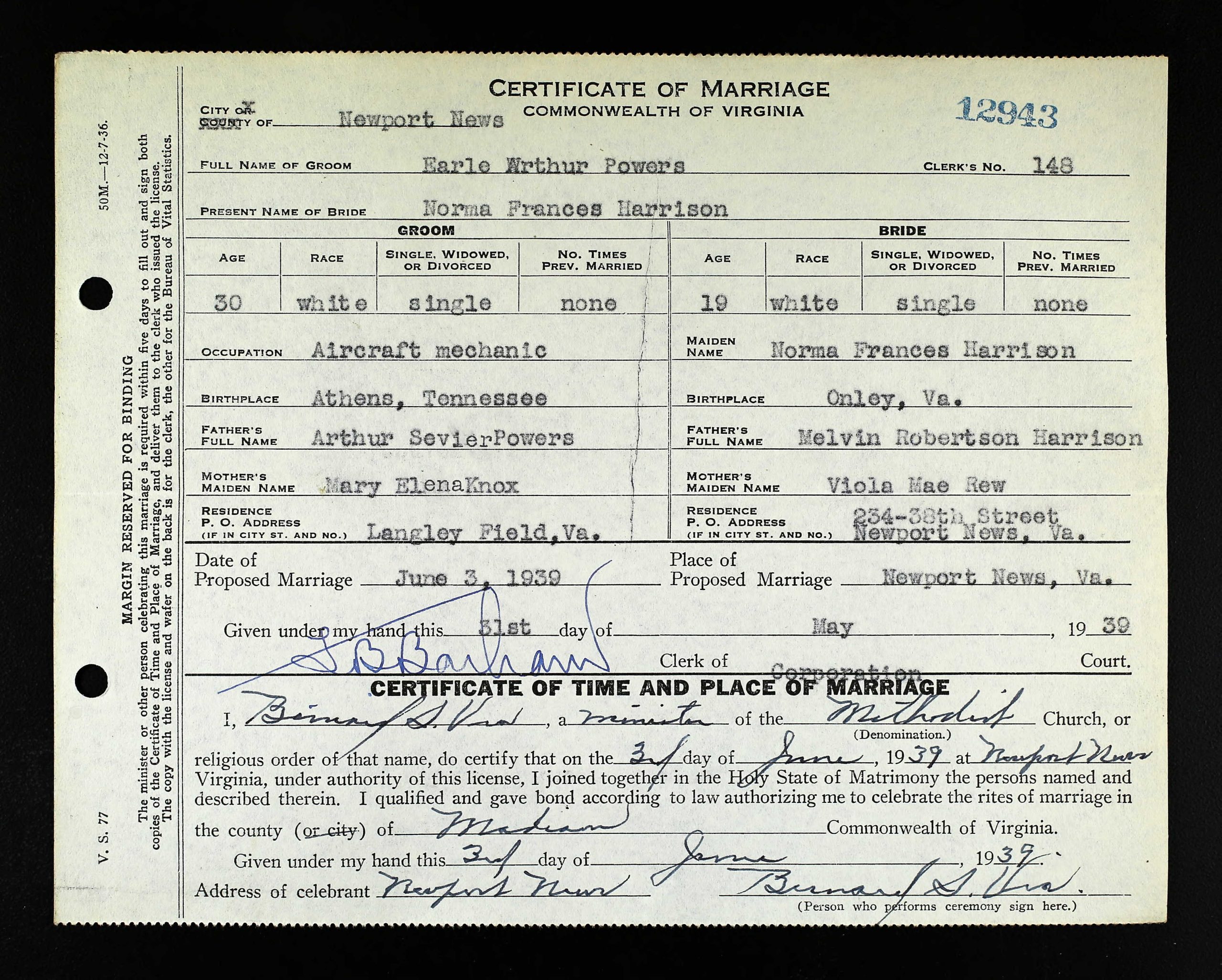 Earl (also spelled as Earle) Arthur Powers was the son of Arthur Sevier Powers and Mary Elena Knox. Husband of Norma Frances Harrison and father of Kenneth Powers.