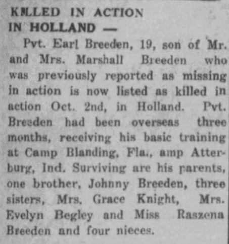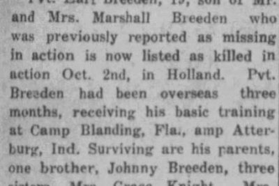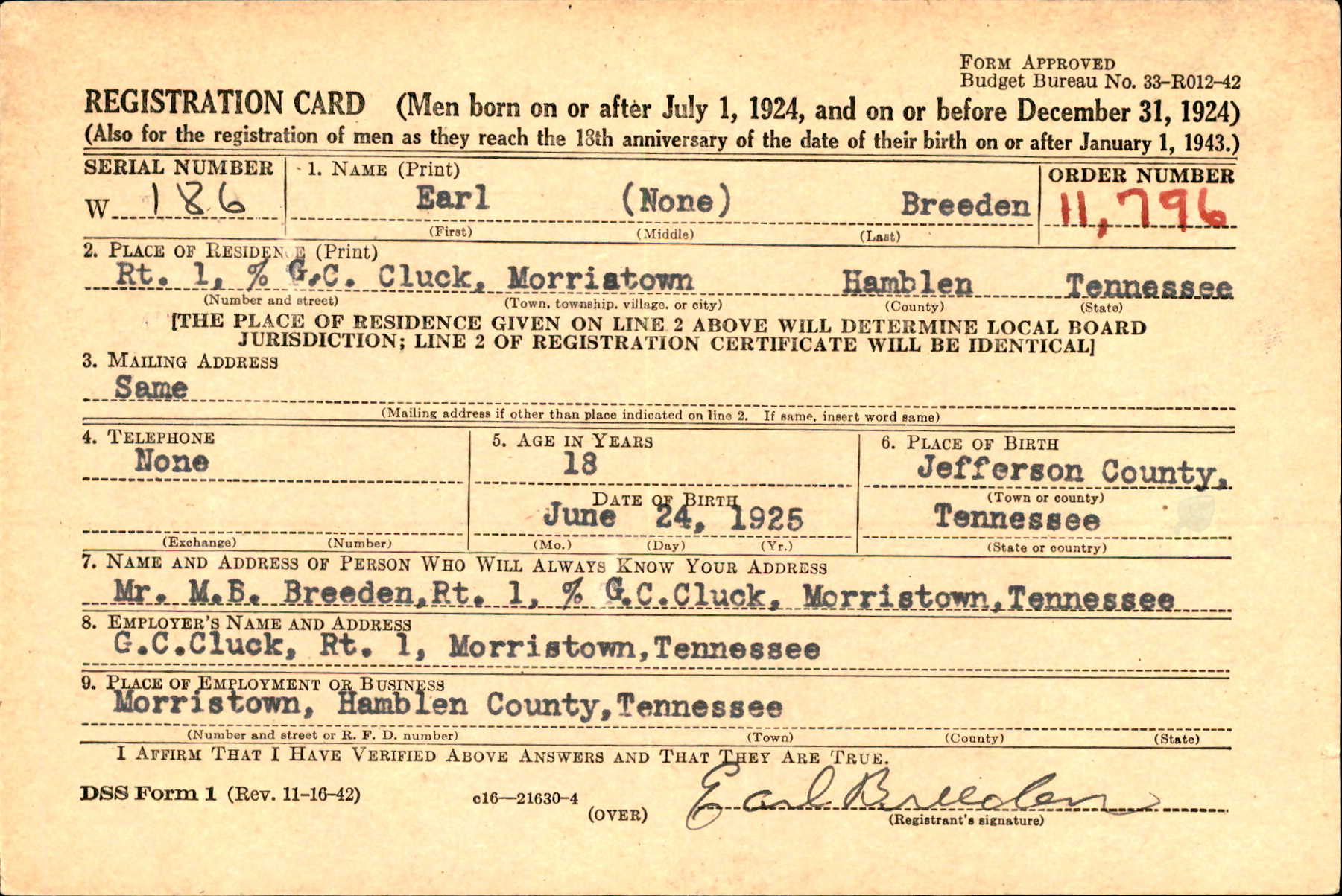 Private Earl Breeden was born in Jefferson County, Tennessee, the son of Marshall Breeden and Mattie Cotter.