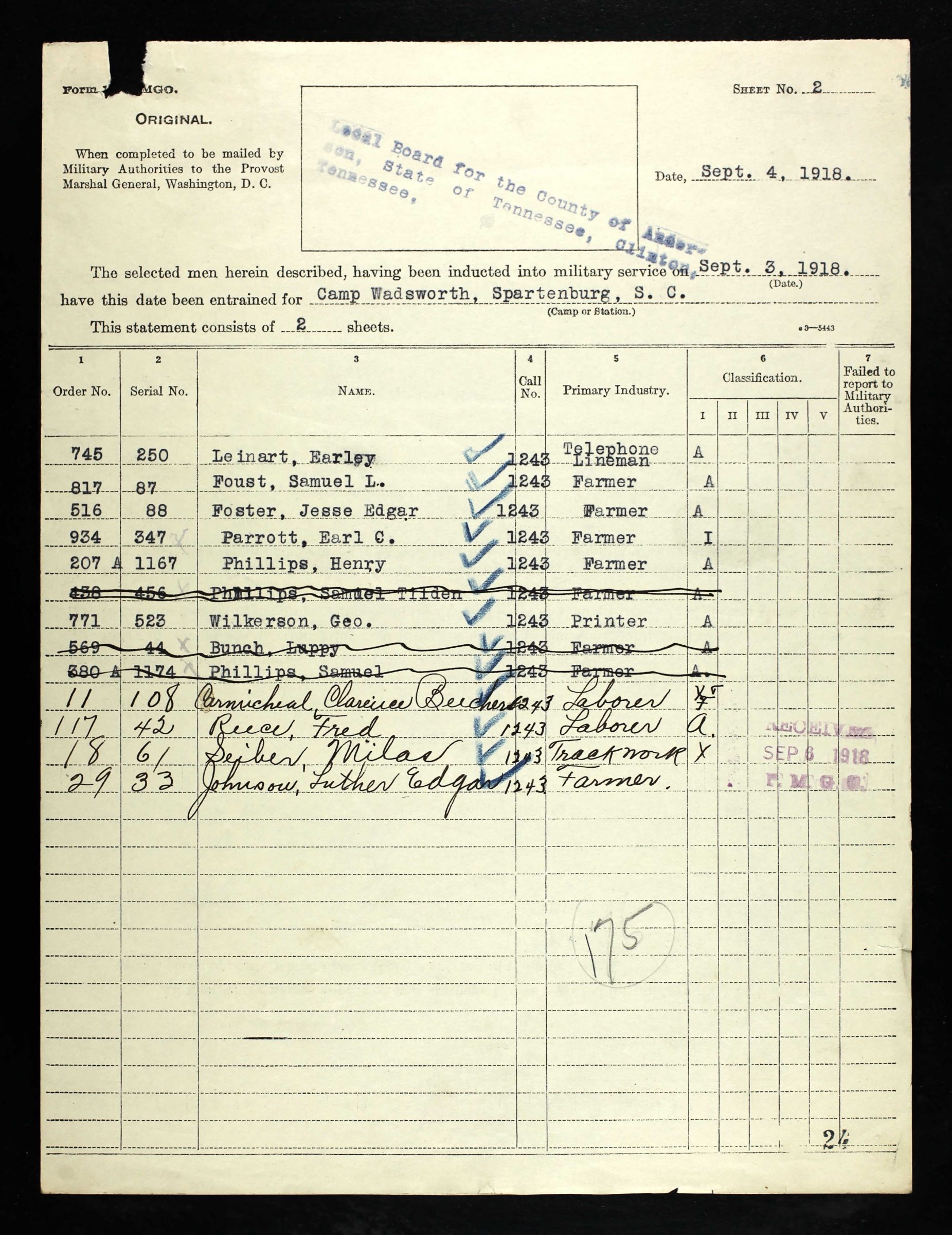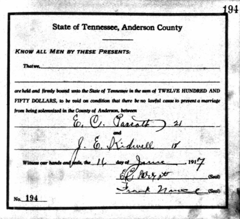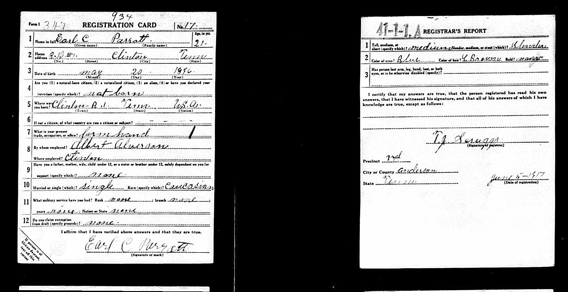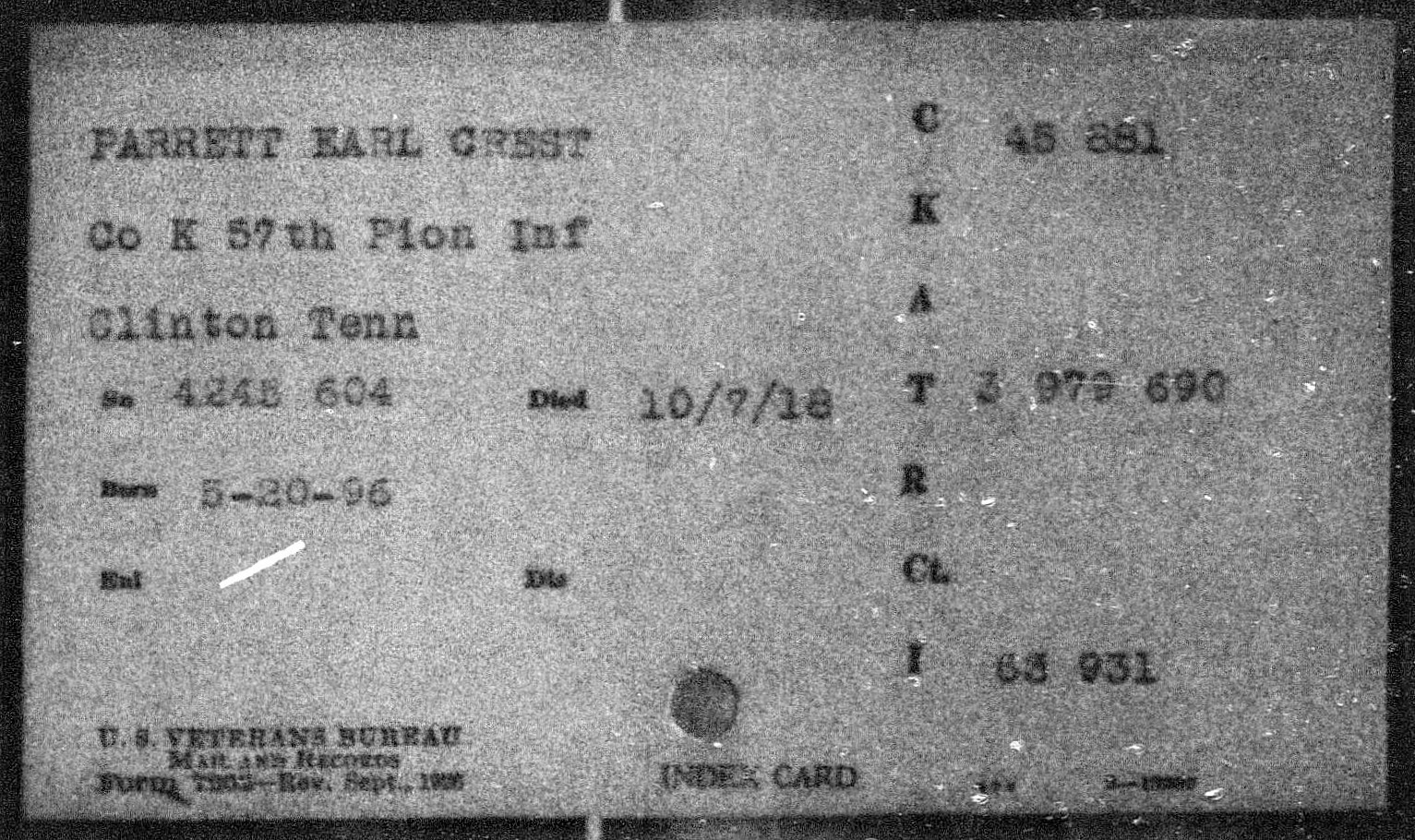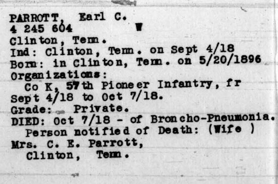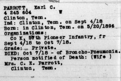 Earl Cranston Parrott was born on May 20, 1896 in Clinton, Tennessee. He was the son of Thomas Eaton Parrott and Nora E. Drew Parrott. He had four sisters, Bessie Parrott (who died in infancy before he was born), Essa Parrott, Mary Parrott, and Ethel Parrott (who died in infancy). He had three brothers, James Fletcher Parrott, Raymond Parrott, and LeRoy Parrott (who died in infancy). Earl Parrott married Jessie Etta Kidwell on June 16, 1917 in Anderson County. Prior to joining the military, he was employed as a farm hand for Albert Alversan. Earl C. Parrott died in France of broncho pneumonia on October 7, 1918. He is buried in Sunset Cemetery in Clinton.