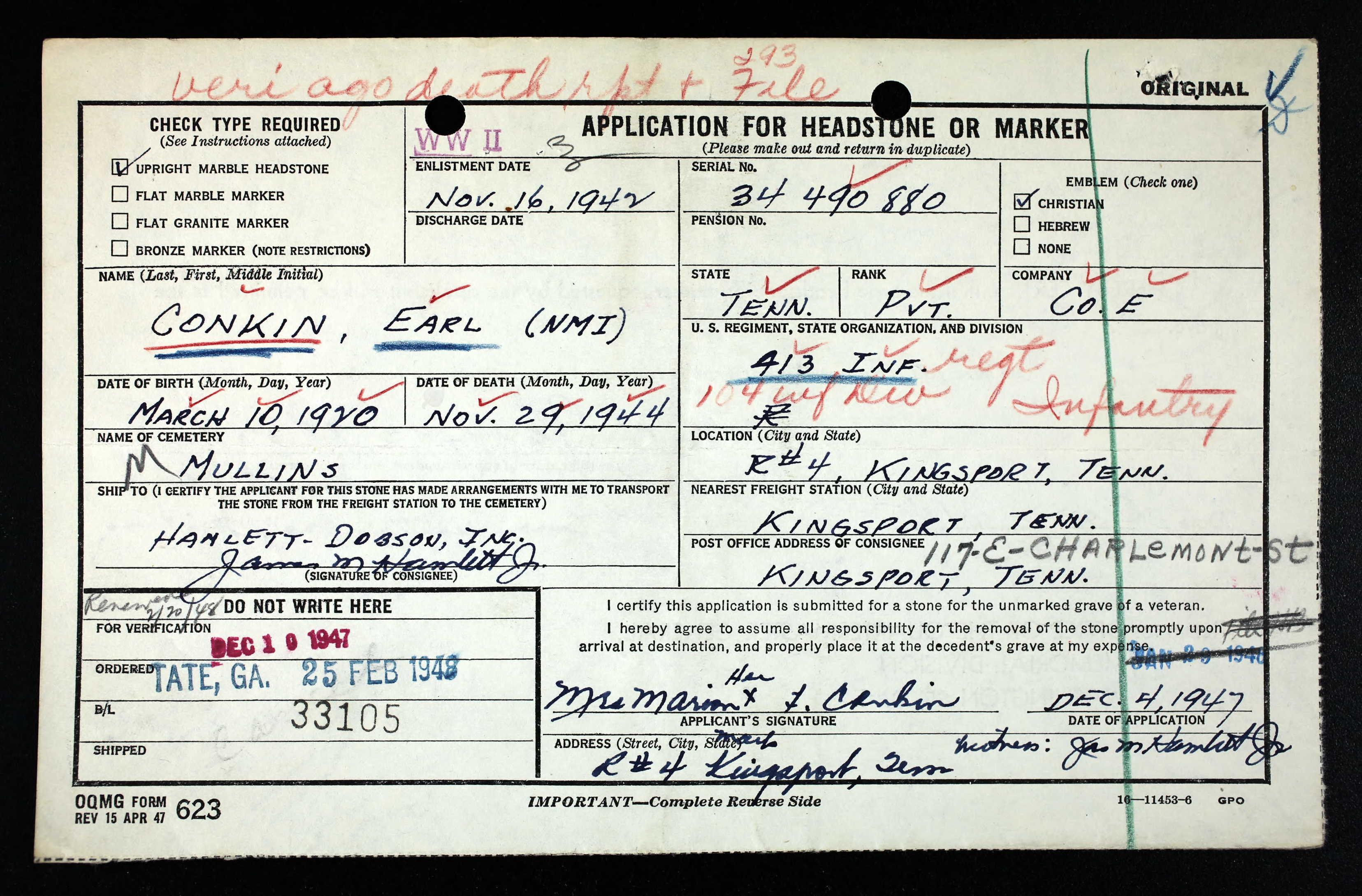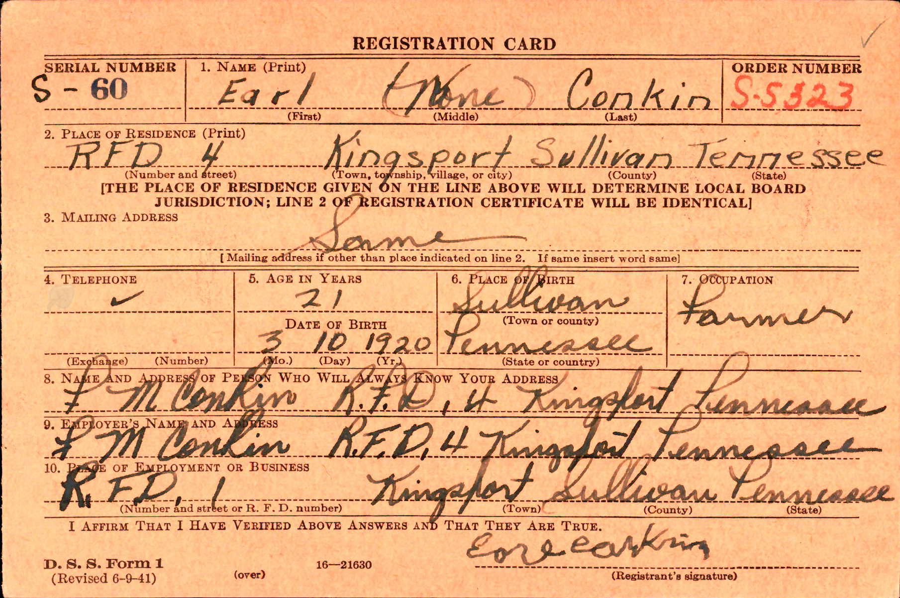 Earl Conkin was born on 10 March 1920. He was the son of Francis Marion Conkin and Elizabeth Barrett.