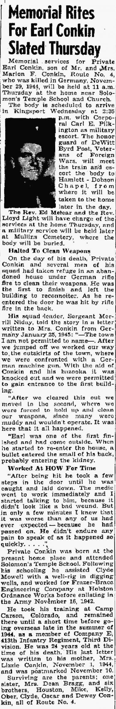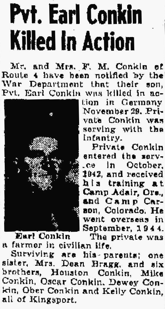 His squad leader, Sergeant Merrill Niday, told the story in a letter written to Mrs. Conkin from Germany January 25, 1945: “–The town I am not permitted to name–. After we jumped off we worked our way to the outskirts of town, where we were confronted with a German machine gun. With the aid of Conkin and his bazooka, it was knocked out and we were permitted to gain entrance to the first building.