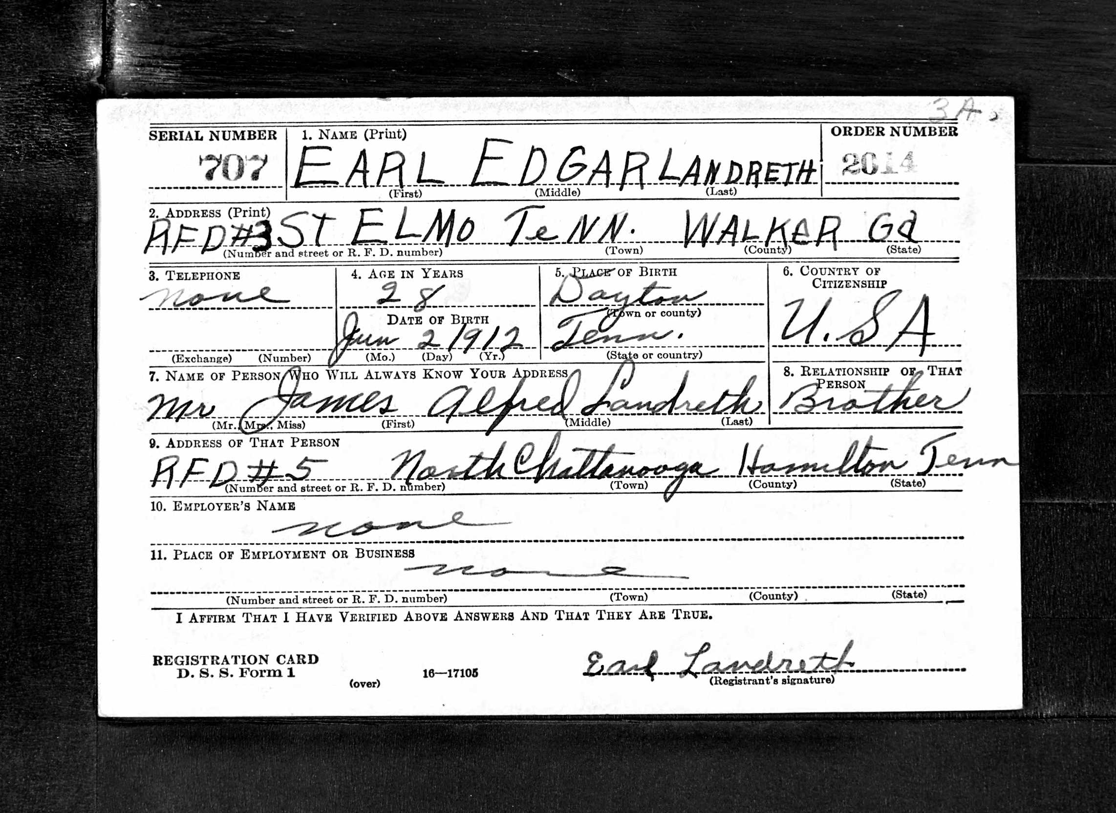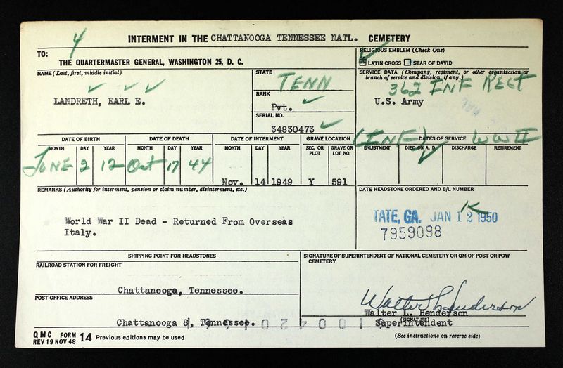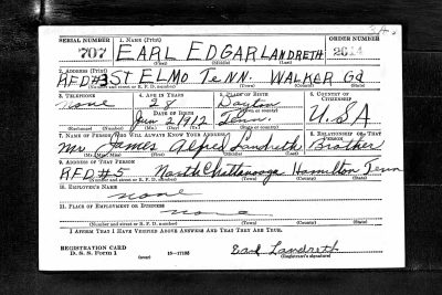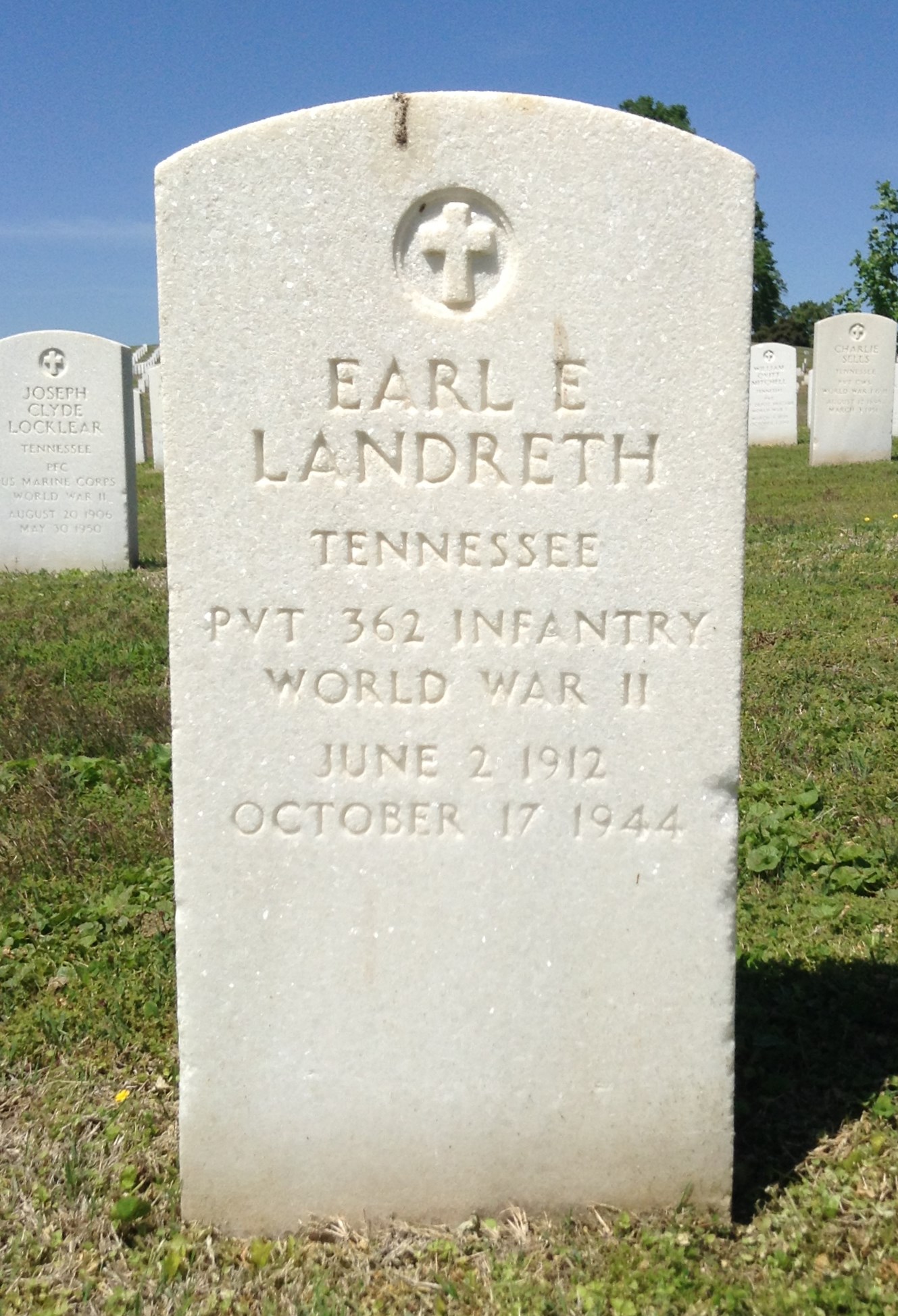 Listed killed in action was Pvt. Earl E. Landreth, son of Mrs. Elizabeth Landreth, Route 5, North Chattanooga. Pvt. Landreth was killed in Italy Oct. 17, the War Department informed his wife, who is a resident of Newport, Ky., and is now visiting in Chattanooga. A native of Chattanooga, Pvt. Landreth was educated in the public schools here and had been in the army approximately 11 months. He went overseas last June. He is survived by his wife, his mother, one brother, James Landreth, Chattanooga; two sister, Mrs. Nellie Johnson, Detroit, Mich., and Mrs. B.F. Crumly, Los Angeles, Calif.