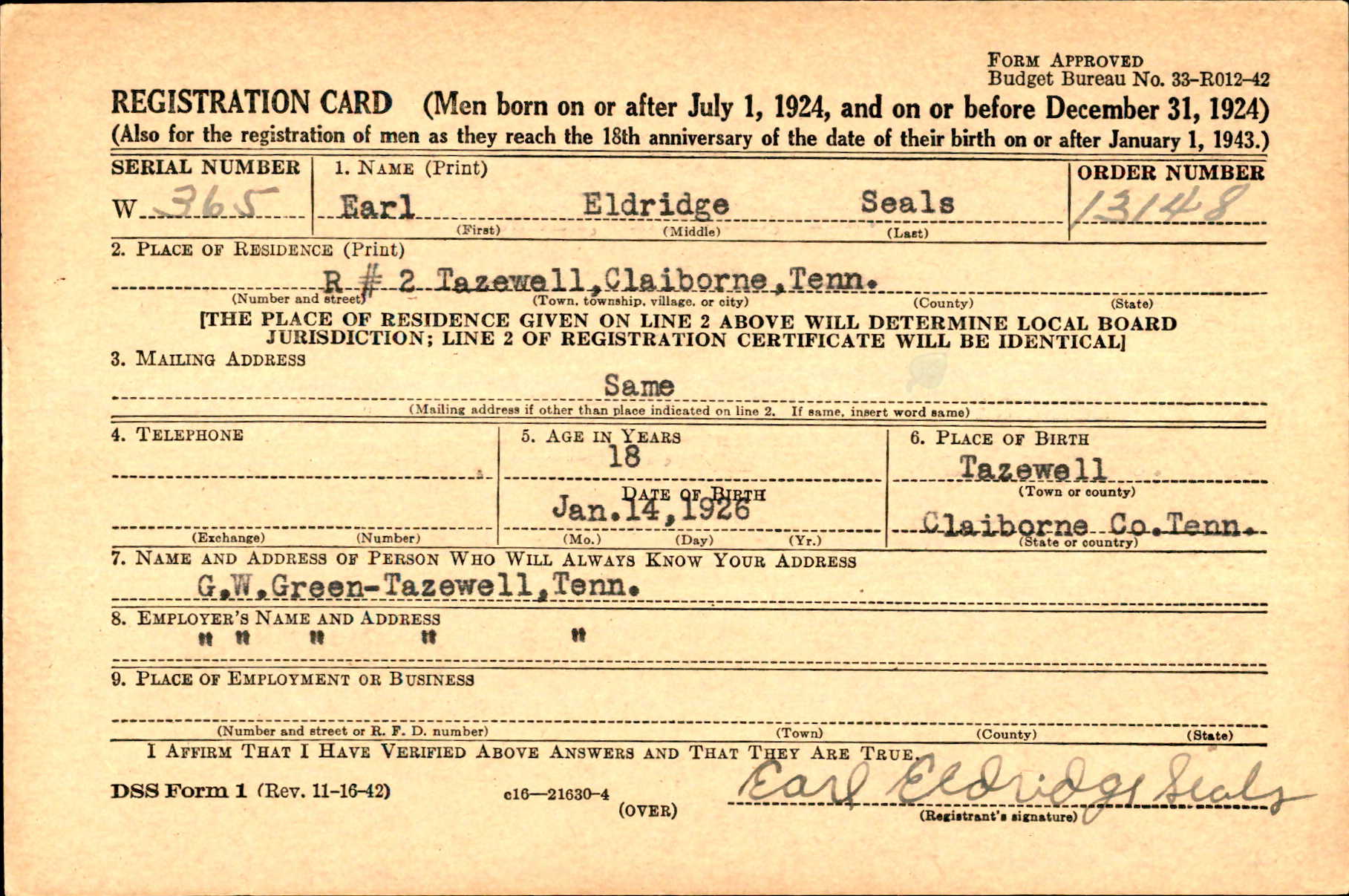 Earl Eldridge Seals was born in Tazewell on 14 January 1926 to William Henry Seals and Lula Green. Both his parents died when he was young and lived with his grandparents, George Washington and Jane Greene.