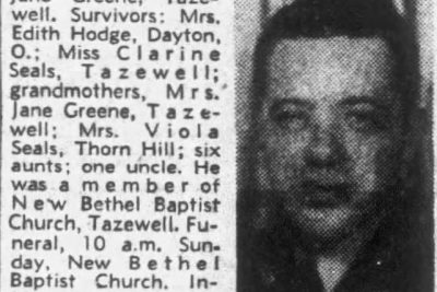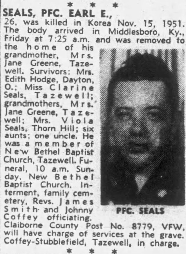 Pfc. Earl E. Seals, 26, was killed in Korea Nov. 15, 1941. The body arrived in Middlesboro, Ky., Friday and was removed to the home of his grandmother, Mrs. Jane Greene, Tazewell. Survivors: Mrs. Edith Hodge, Dayton, O.; Miss Clarine Seals, Tazewell; grandmothers, Mrs. Jane Greene of Tazewell and Mrs. Viola Seals of Thorn Hill; six aunts; one uncle. He was a member of New Bethel Baptist Church, Tazewell.