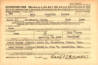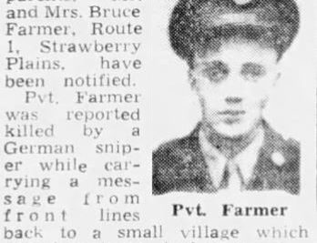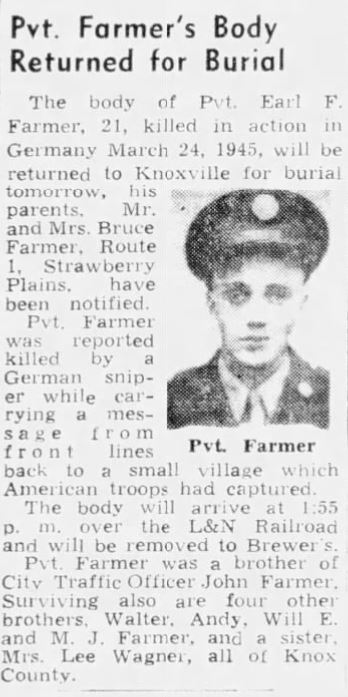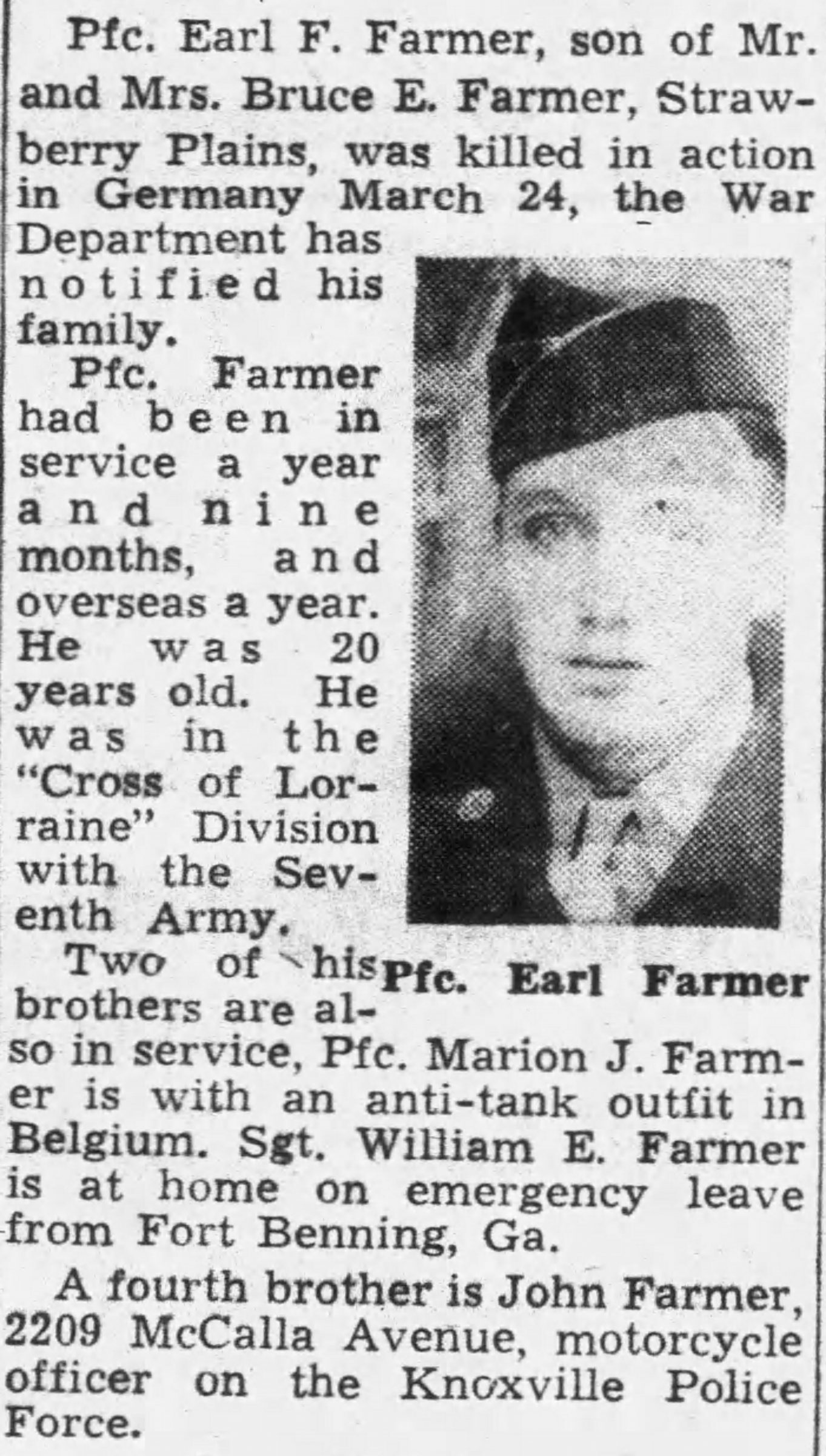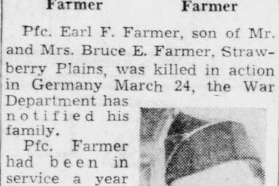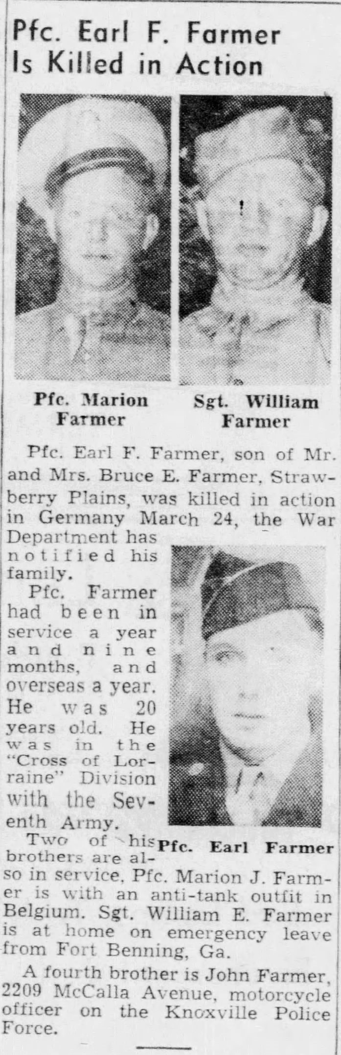 Pfc. Earl F. Farmer, son of Mr. and Mrs. Bruce E. Farmer, Strawberry Plains, was killed in action in Germany March 24, the War Department has notified his family. Pfc. Farmer had been in Service a year and nine months, and overseas a year. He was 20 years old. He was in the “Cross of Lorraine” Division with the Seventh Army. Two of his brothers are also in the service, Pfc. Marion J. Farmer is with an anti-tank outfit in Belgium. Sgt. William E. Farmer is at home on emergency leave from Fort Benning, Ga. A fourth brother is John Farmer, 2209 McCalla Avenue, motorcycle officer on the Knoxville Police Force.
