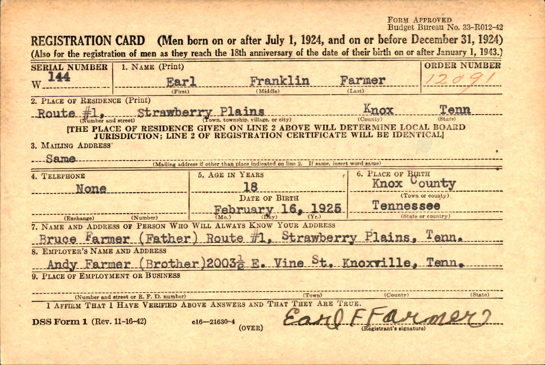Earl Franklin Farmer was born in 1925, the son of Bruce Edward Farmer and Carrie Shubert.