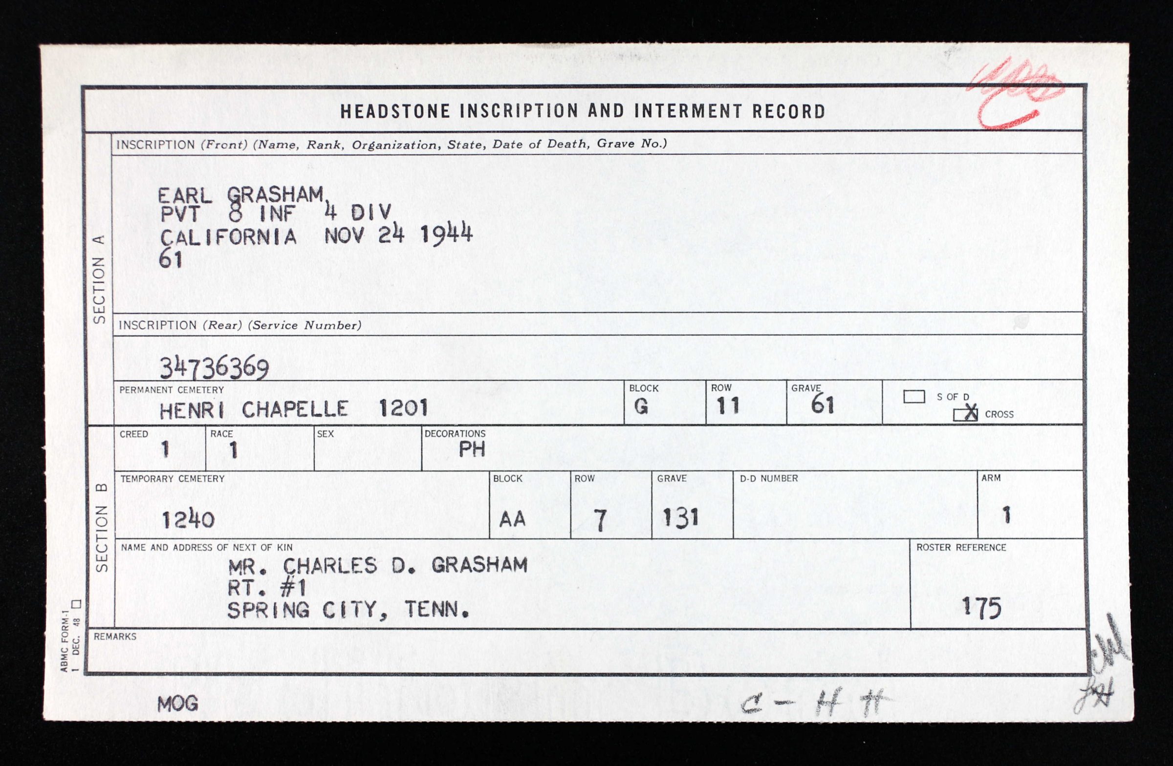 - Burial/Memorial Location: Henri-Chapelle American Cemetery, Henri-Chapelle, Belgium