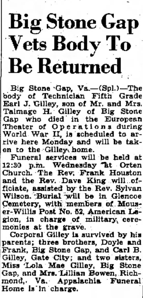 Big Stone Gap, Va. – The body of Technician Fifth Gade Earl J. Gilley, son of Mr. and Mrs. Talmage H. Gilley of Big Stone Gap who died in the European Theater of Operations during World War II, is scheduled to arrive here Monday and will be taken to the Gilley home.