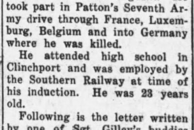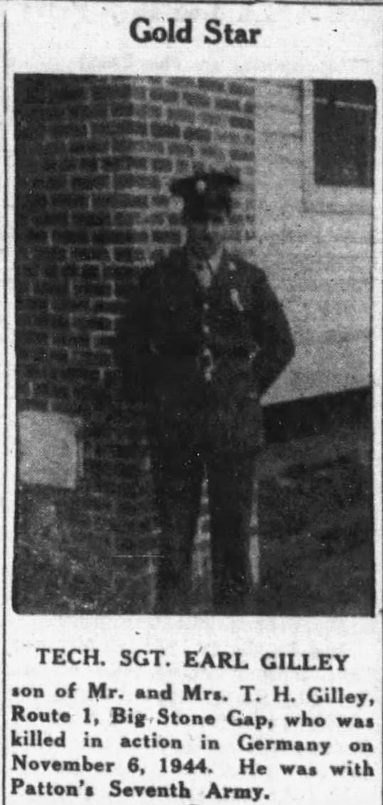 Mrs. T.H. Gilley, route 1, Big Stone Gap, has received a letter from one of the buddies of Tech. Sgt. Earl J. Gilley, who was killed in action in Germany on November 6, 1944. Sgt. Gilley was inducted on November 2, 1942 and went overseas in February 21, 1943, winning a citation and promotion in the North African campaign. He participated in the invasion of Sicily where he was again promoted. He was then sent to England where he participated in the Invasion of France on June 6th and won a citation and medal and was promoted to technical sergeant. He took part in Patton’s Seventh Army drive through France, Luxembourg, Belgium and into Germany where he was killed. He attended high school in Clinchport and was employed by the Southern Railway at time of his induction. He was 23 years old.