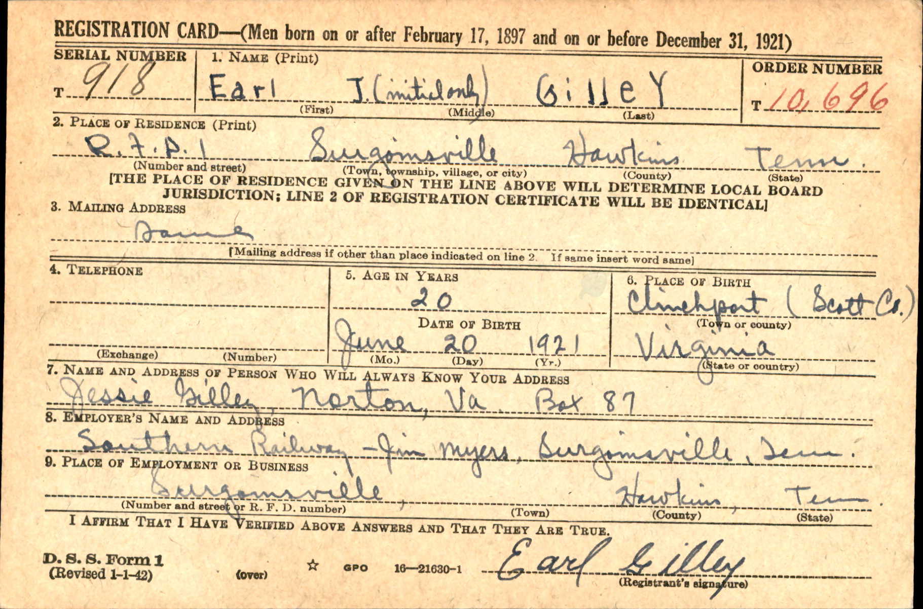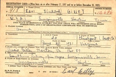 Earl Jessee Gilley was born on 20 June 1921 at Clinchport, Scott County, Virginia, the son of Talmadge H. Gilley and Callie Powell Kindle. His brother, Pfc. Carl B. Gilley served in France.