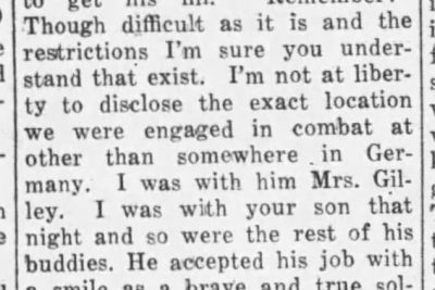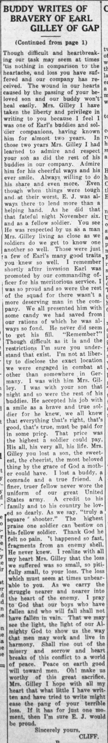 Suppose you will be quite surprised to hear from me. Though I’ve never had the pleasure of meeting you, I feel like I have know you all along for I had heard E.J. as he was known by me and the rest of his buddies in our company speak of you and his family so often. Even though we are separated by many thousands of miles over land and sea there is never a moment spent that our thoughts and prayers aren’t with our loved ones. Our fathers and mothers who gave us birth, our brothers and sisters and our friends all united in this great task that will surely bring us victory and peace on earth again. Though difficult and heartbreaking our task may seem at times ‘tis nothing in comparing to the heartache, and loss you have suffered and our company has received. The wound in our hearts caused by the passing of your beloved son and our buddy won’t heal easily. Mrs. Gilley, I have taken the liberty and privilege in writing to you because I feel I was one of Earl’s buddies and soldier companions, having known him for almost two years. In those two years Mrs. Gilley, I had learned to admire and respect your son as did the rest of his buddies in our company. Admire him for his cheerful ways and his ever smile. Always willing to do his share and even more. Even though when things were tough and at their worst, E.J. was always there to lend more than a helping hand. As he did that that fateful night November six, and as a fellow soldier. You see, he was respected by us as a man Mrs. Gilley, living as close as we soldiers do we get to know one another so well. Those were just a few of Earl’s many good traits you knew so well. I remember shortly after invasion Earl was promoted by our commanding officer for his meritorious service. I was so proud and so were the rest of the squad for there wasn’t a more deserving man in the company. We all presented him with some candy we had saved from our rations of which he was always so fond. He never did seem to get his fill. “Remember?” Though difficult as it is and the restrictions I’m sure you understand that exist. I’m not at liverty to disclose the exact location we were engaged in combat at other than somewhere in Germany. I was with him Mrs. Gilley. I was with your son that night and so were the rest of his buddies. He accepted his job with a smile as a brave and true soldier for he knew, we all knew that everything that’s right, that’s good, that’s true, must be paid for in some price. That price was the highest a soldier could pay, His all, his very all, his life. Mrs. Gilley, you lost a son, the sweetest, the cheeriest, the most beloved thing by the grace of God a mother could have. I lost a buddy, a comrade and a true friend. A finer, truer fellow never wore the uniform of our great United States army. A credit to his family and to his country he loved so dearly. As we say, “truly a square shooter.” The highest praise one soldier can bestow on his fellow soldier. Thank God he felt no pain. It happened so fast, fragments from an enemy shell. He never knew. I realize with all my heart Mrs. Gilley that the loss we suffered was so small, so pitifully small, to your loss. The loss which must seem at times unbearable to you. As we carry the struggle nearer and nearer into the heart of the enemy. I pray to God that our boys who have fallen and who will fall shall not have fallen in vain. That we may see the light, the light of our Almighty God to show us the way that men may work and live in harmony. Shall rise out of the misery and sorrow and heart breaks of this conflict to a world of peace. Peace on heart good will toward men. Oh! Make us worthy of this great sacrifice. Mrs. Gilley I hope with all my heart that what little I have written and have tried to write might ease the pain of your terrible loss. If it has for just one moment, then I’m sure E.J. would be proud.
