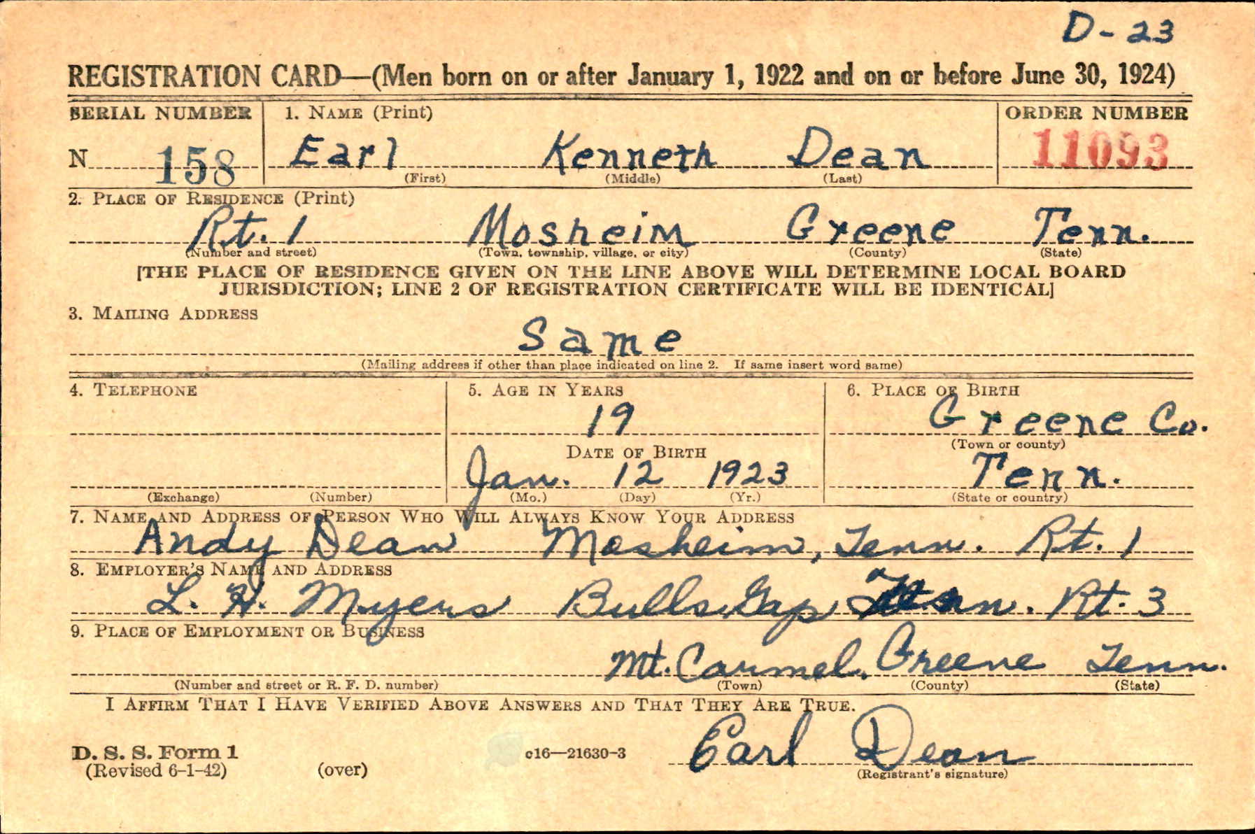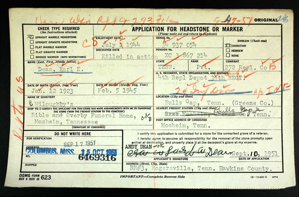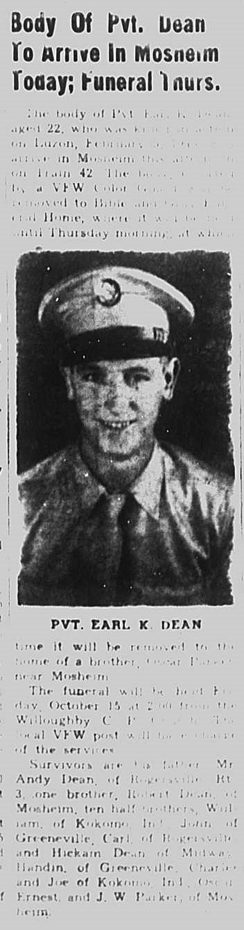 The body of Pvt. Earl K. Dean, aged 22, who was killed in action on Luzon, February 5, 1945, will arrive in Mosheim this afternoon on Train 42. Survivors are his father, Mr. Andy Dean of Rogersville, Rt. 3, one brother, Robert Dean of Mosheim; ten halfbrothers, William of Kokomo, Ind., John of Greeneville, Carl of Rogersville and Hickman Dean of Midway, Handin of Greeneville, Charles and Joe of Kokomo, Ind., Oscar, Ernest and J.W. Parker of Mosheim.