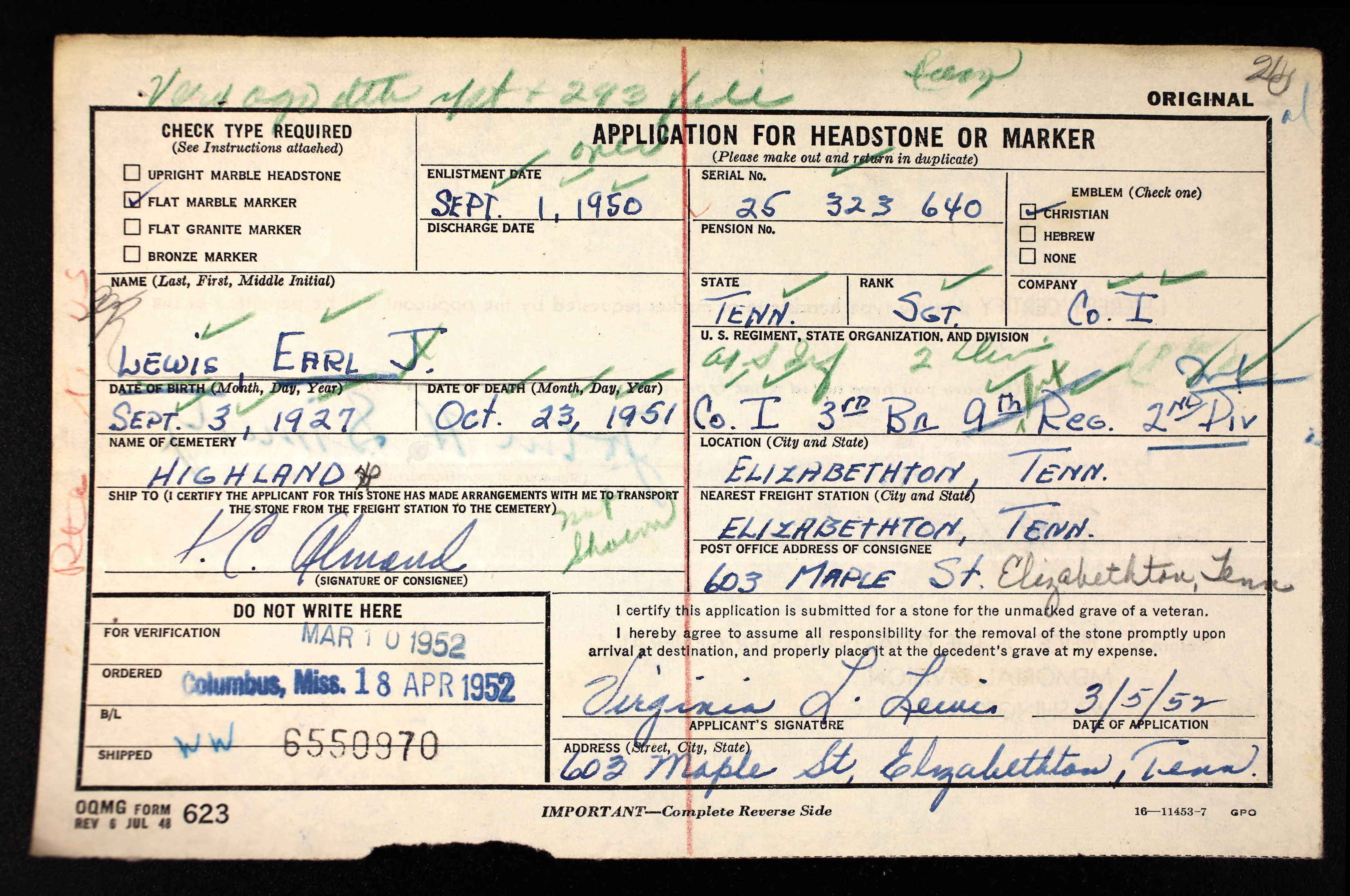 Sergeant Lewis was a member of Company I, 3rd Battalion, 9th Infantry Regiment, 2nd Infantry Division. On October 23, 1951, he was killed from fragment wounds from a grenade that was thrown into a fire and exploded near Satae, North Korea.