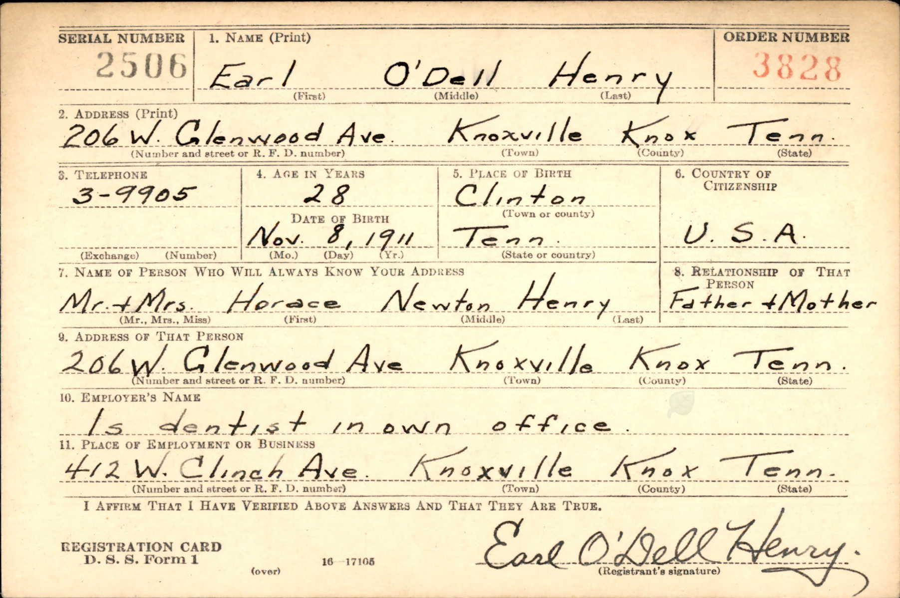 Earl O’Dell Henry was the son of Horace Nelson Henry and Arletta Odell. Husband of Jane Covington and father of Earl Henry Jr.
