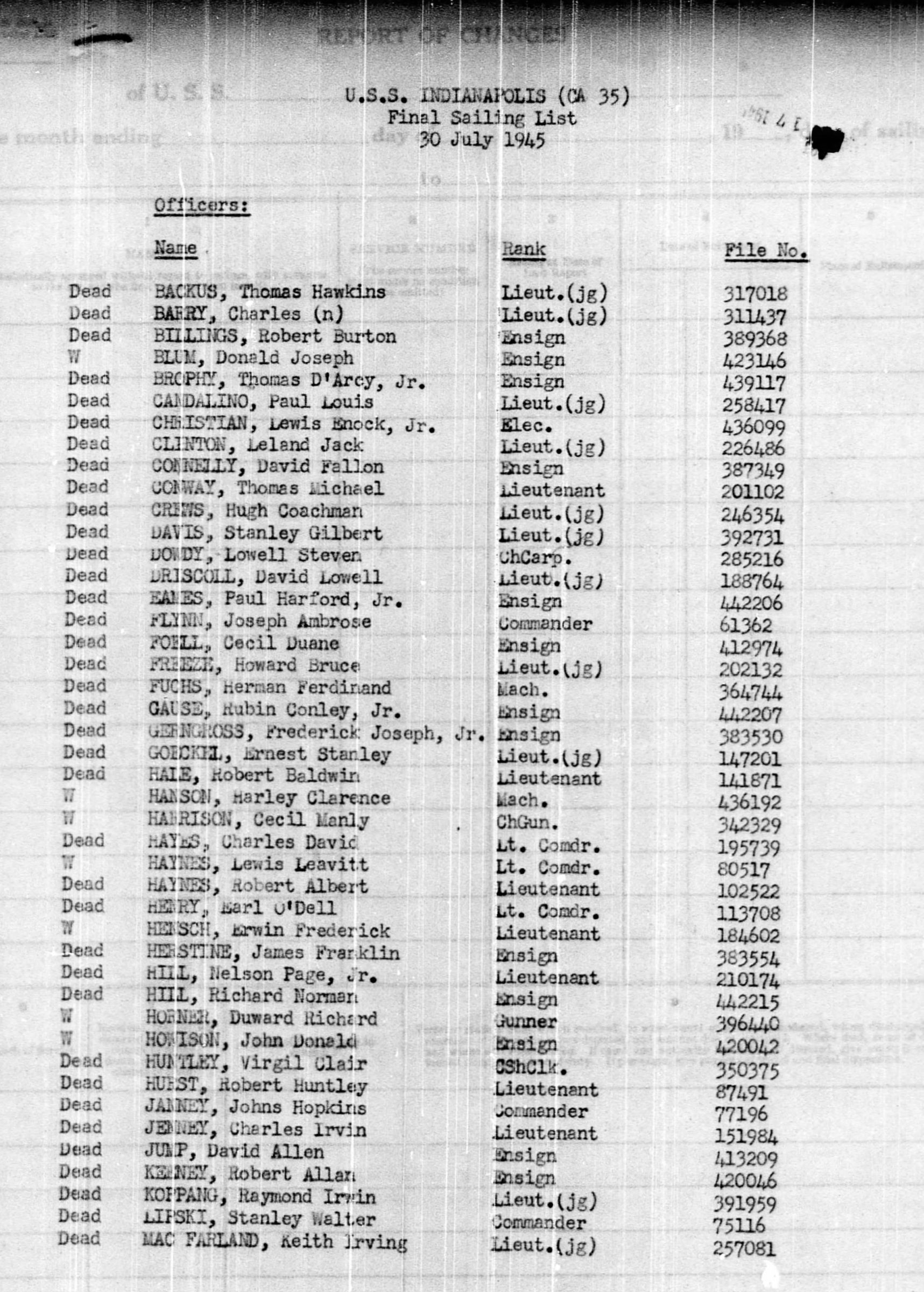 He served as a dental officer for 12 months at Parris Island, South Carolina, and 14 months at the U.S. Naval Academy. Served 12 months aboard the USS Indianapolis in the Pacific He died when it was sunk on July 30, 1945, after the ship had delivered the components of the first atomic bomb to Tinian. He is memorialized at Manila American, Cemetery, Fort Bonifacio, Manila, Philippines.