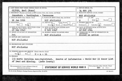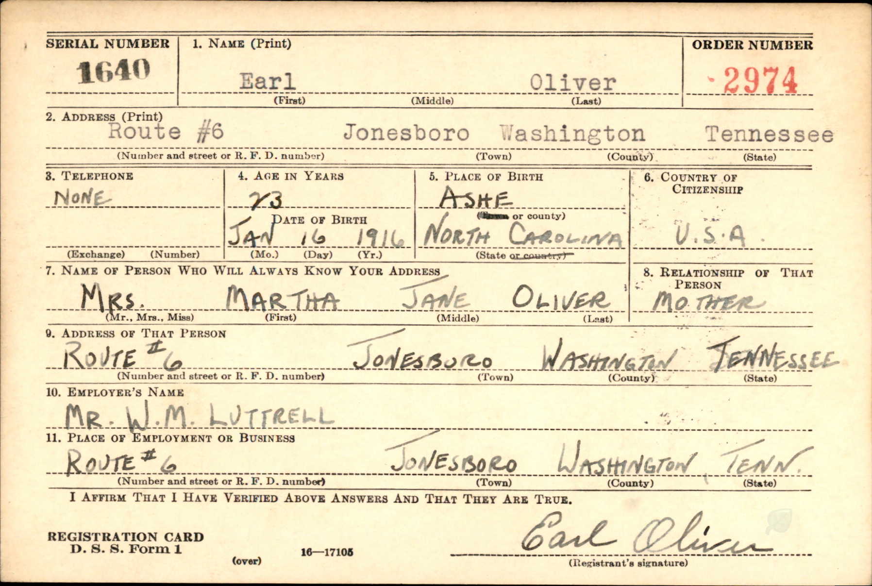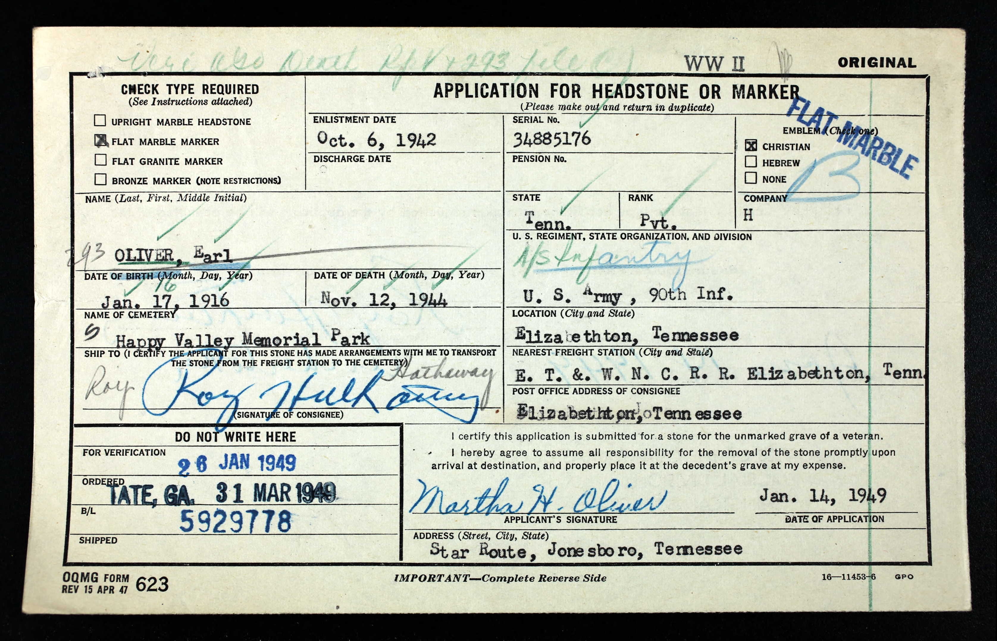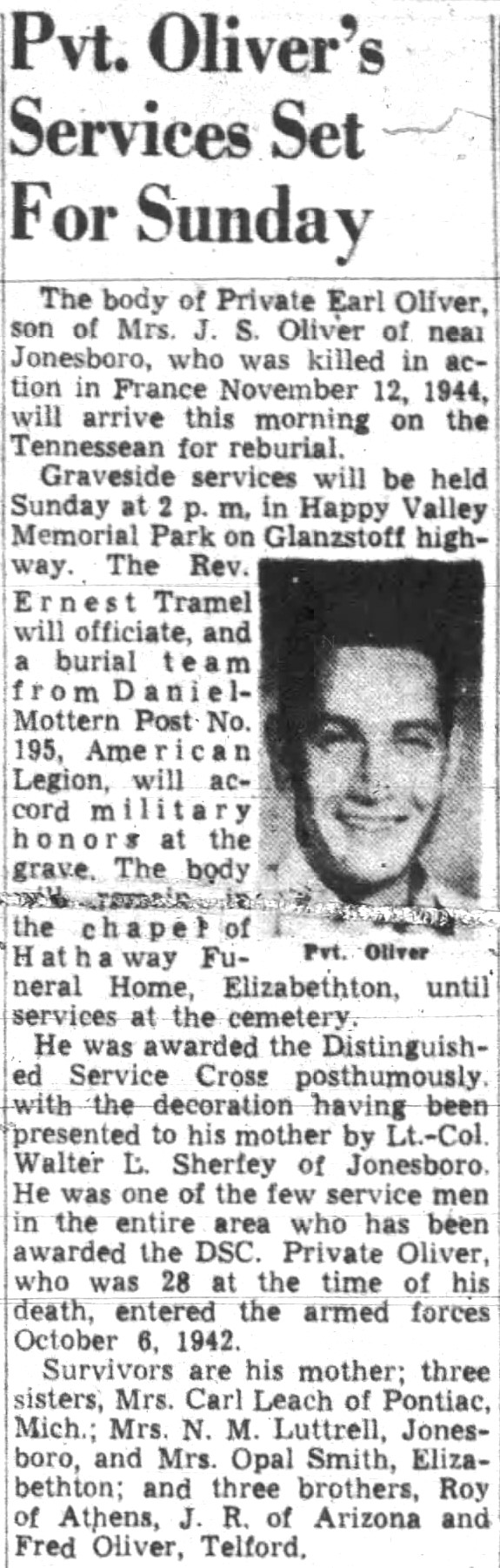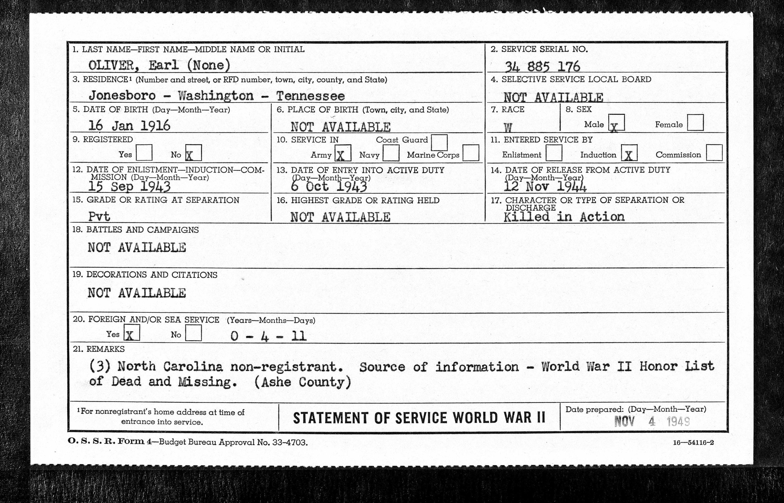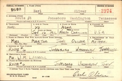 Earl Oliver was born on 17 January 1916 in Ashe, North Carolina. Earl was the son of John Smith Oliver and Martha Jane Hilliard. His younger brother Fred served in the United States Navy during World War II. Earl Oliver considered Jonesborough, Washington County, Tennessee his home. He was a bus driver before enlisting in the United States Army at Fort Oglethorpe, Georgia on 15 September 1943.