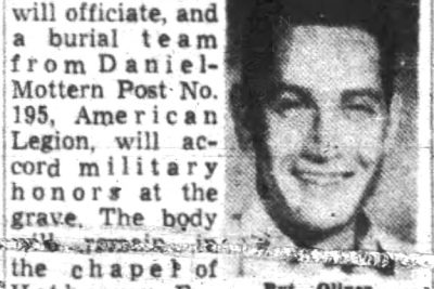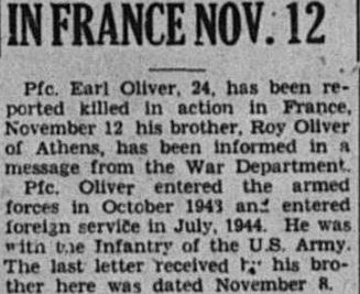 Pfc. Earl Oliver, 24, has been reported killed in action in France November 12 his brother, Roy Oliver of Athens, has been informed in a message from the War Department. Pfc. Oliver entered the armed forces in October 1943 and entered the foreign service in July, 1944. He was with the Infantry of the U.S. Army. His last letter received by his brother here was dated November 8. Prior to entering the armed forces Pfc. Oliver was employed with the Carl Medlin bus Lines. He made his home with his brothers here before entering the armed forces and was well known in Athens.
