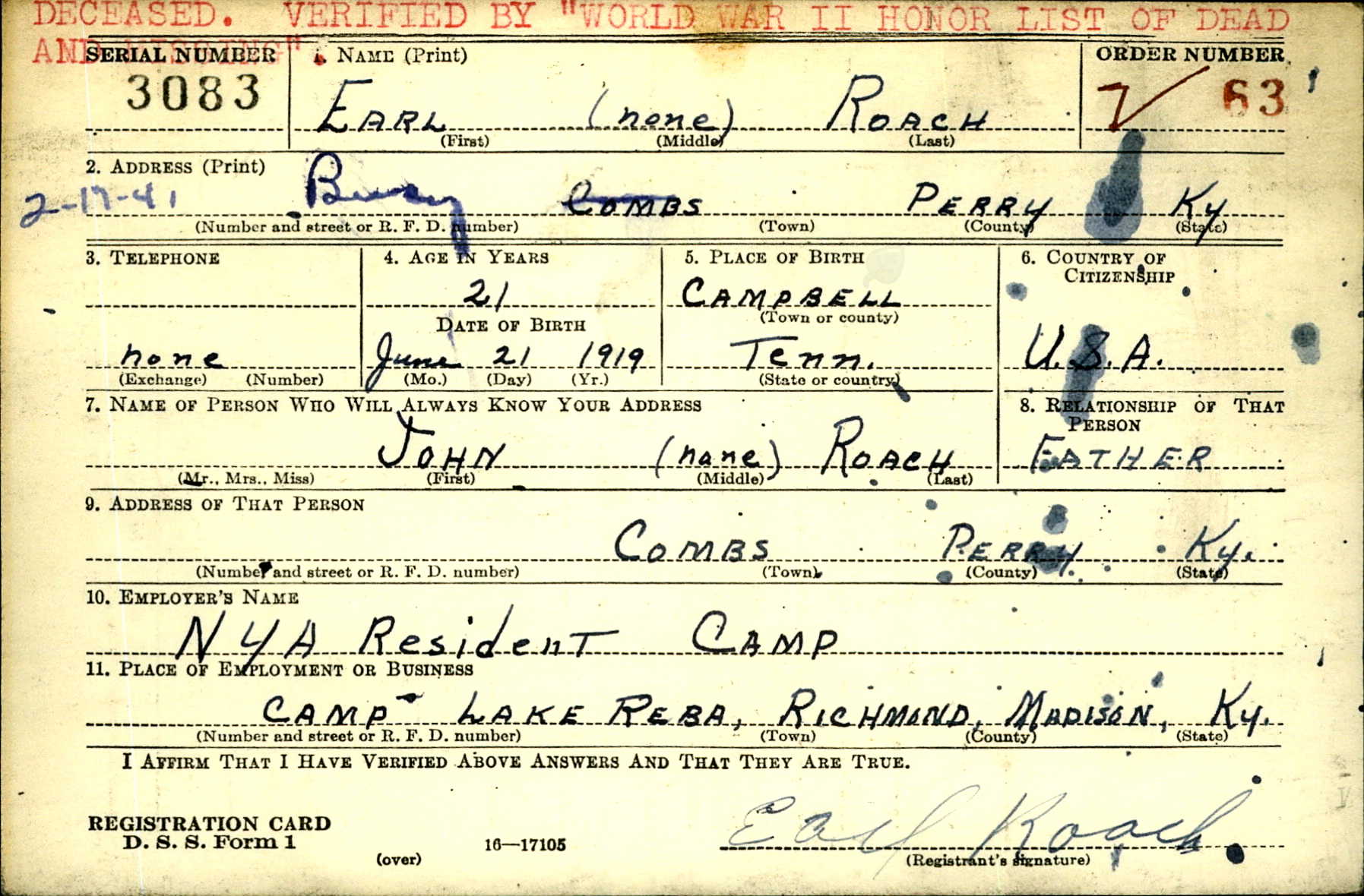 The body of Pfc. Earl Roach arrived in LaFollette Wednesday afternoon. Pfc. Roach was killed in action April 4, 1945 in Holland. He is survived by his parents; Mr. and Mrs. John Roach of LaFollette and one sister, Mrs. James McCullah of Clinton. Interment will be in Pond Cemetery with Military services at the grave.