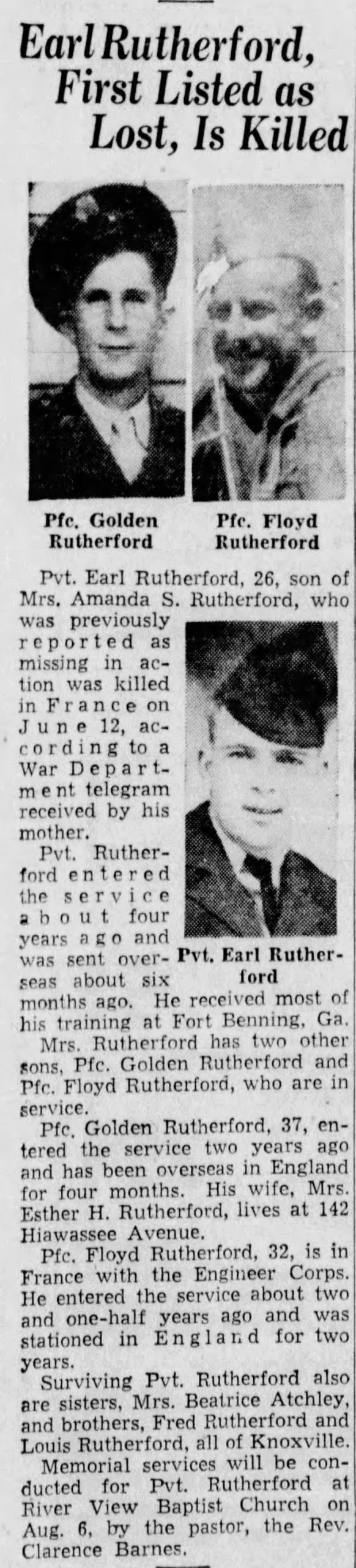 Pvt. Earl Rutherford, 26, son of Mrs. Amanda S. Rutherford, who was previously reported as missing in action was killed in France on June 12, according to a War Department telegram received by his mother. Pvt. Rutherford entered the service about four years ago and was sent overseas about six months ago. He received most of his training at Fort Benning, Ga. Mrs. Rutherford has two other sons, Pfc. Golden Rutherford and Pfc. Floyd Rutherford, who are in service. Pfc. Golden Rutherford, 37, entered the service two years ago and has been overseas in England for four months. His wife, Mrs. Esther H. Rutherford, lives at 142 Hiawassee Avenue. Pfc. Floyd Rutherford, 32, is in France with the Engineer Corps. He entered the service about two and one-half years ago and was stationed in England for two years. Surviving Pvt. Rutherford also are sister, Mrs. Beatrice Atchley, and brothers, Fred Rutherford and Louis Rutherford, all of Knoxville.