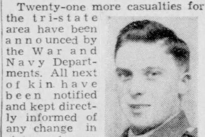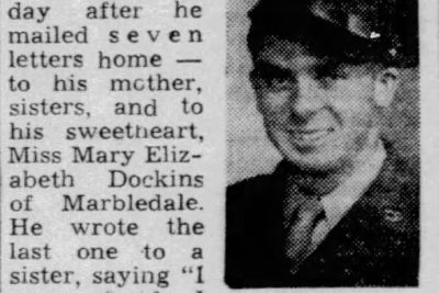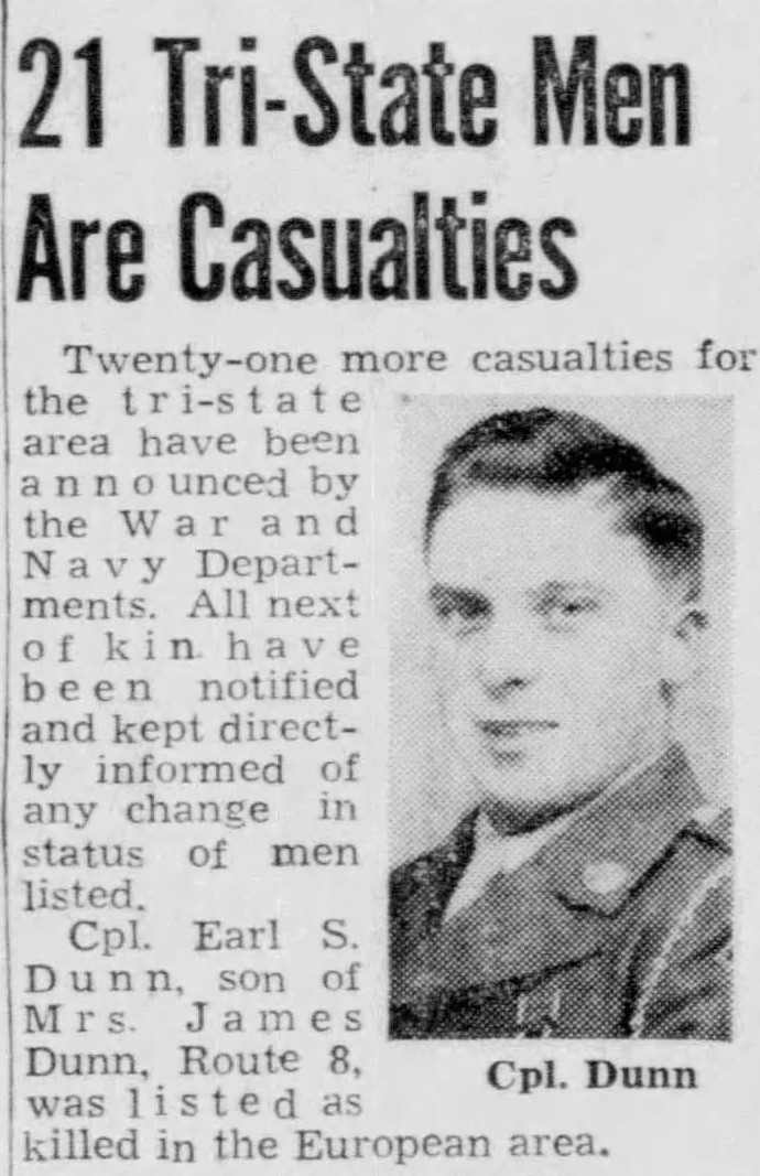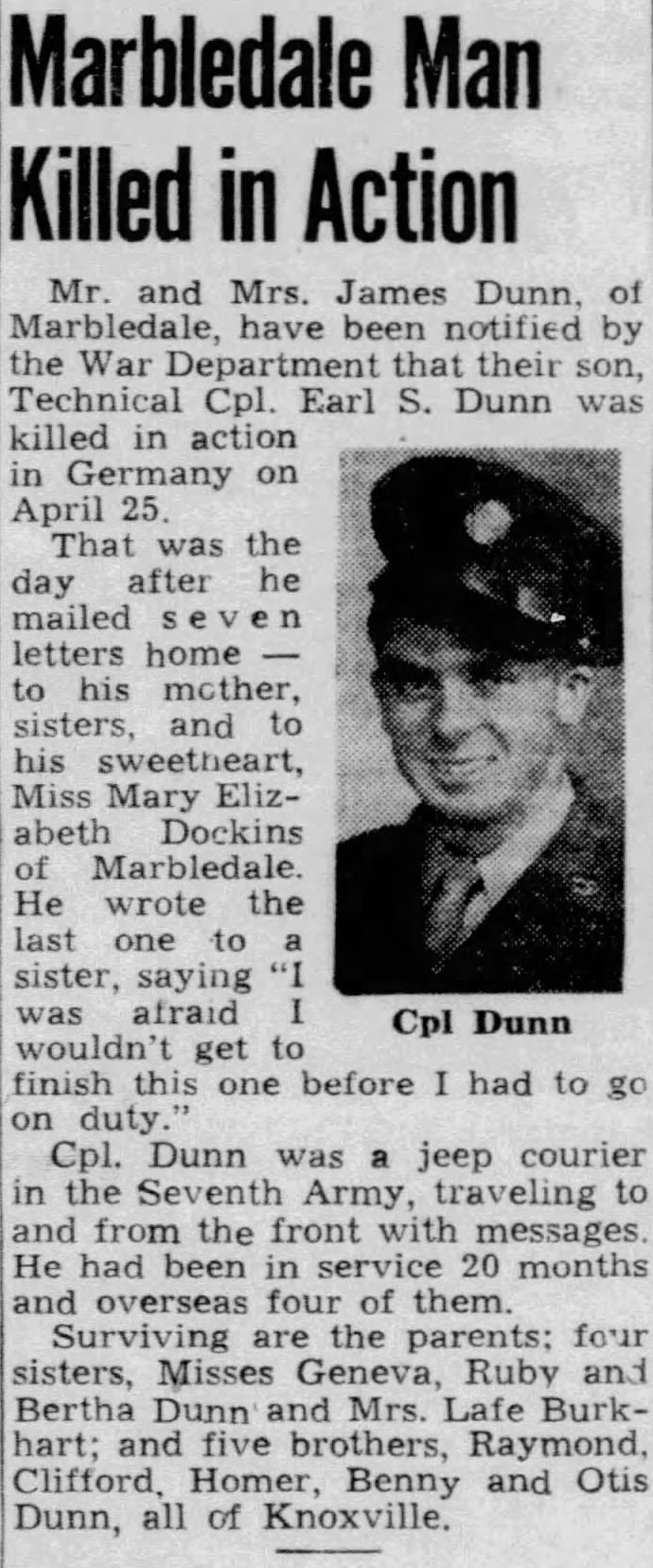 Mr. and Mrs. James Dunn, of Marbledale, have been notified by the War Department that their son, Technical Cpl. Earl S. Dunn was killed in action in Germany on April 25. That was the day after he mailed seven letters home – to his mothers, sisters, and to his sweetheart, Miss Mary Elizabeth Dockins of Marbledale. He wrote the last one to a sister, saying “I was afraid I wouldn’t get to finish this one before i had to go on duty.” Cpl. Dunn was a jeep courier in the Seventh Army, traveling to and from the front with messages. He had been in service 20 months and overseas four of them.