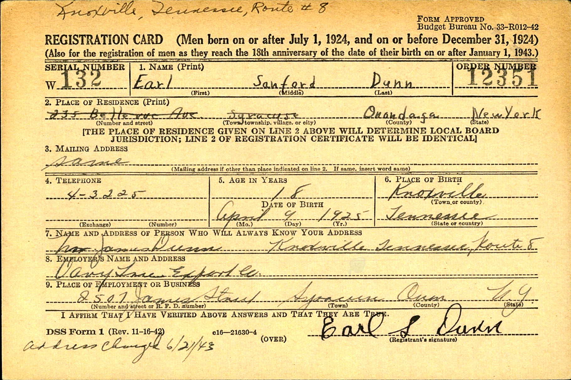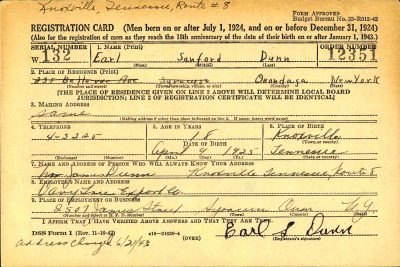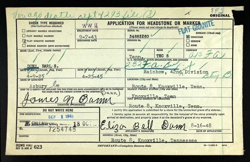 Earl Sanford Dunn was born on 9 April 1925 in Knoxville, Tennessee, the son of James and Bertha Dunn. He enlisted on August 17, 1943, in Fort Oglethorpe, GA.