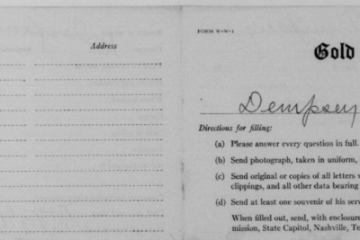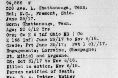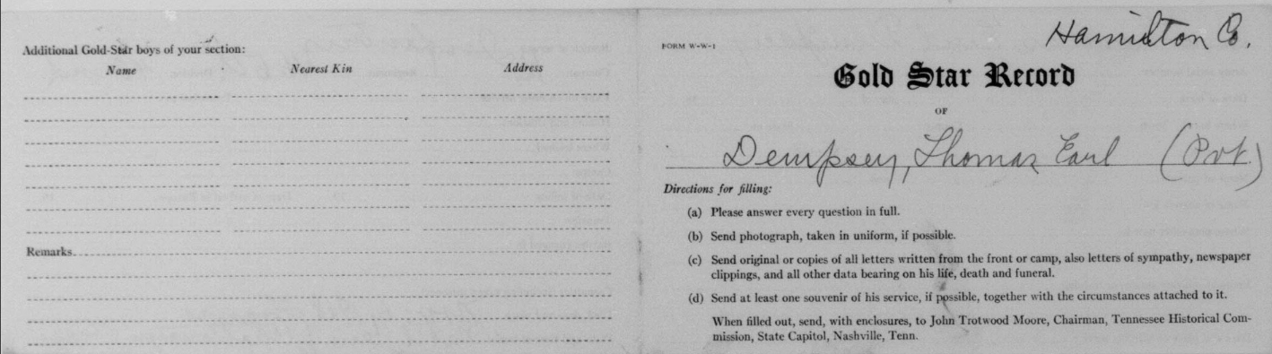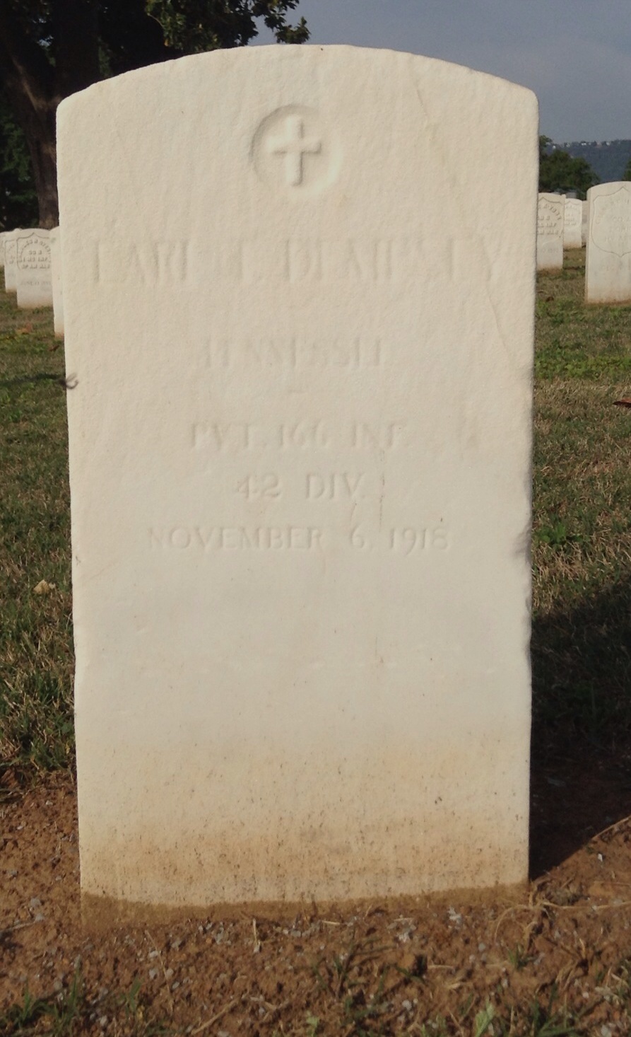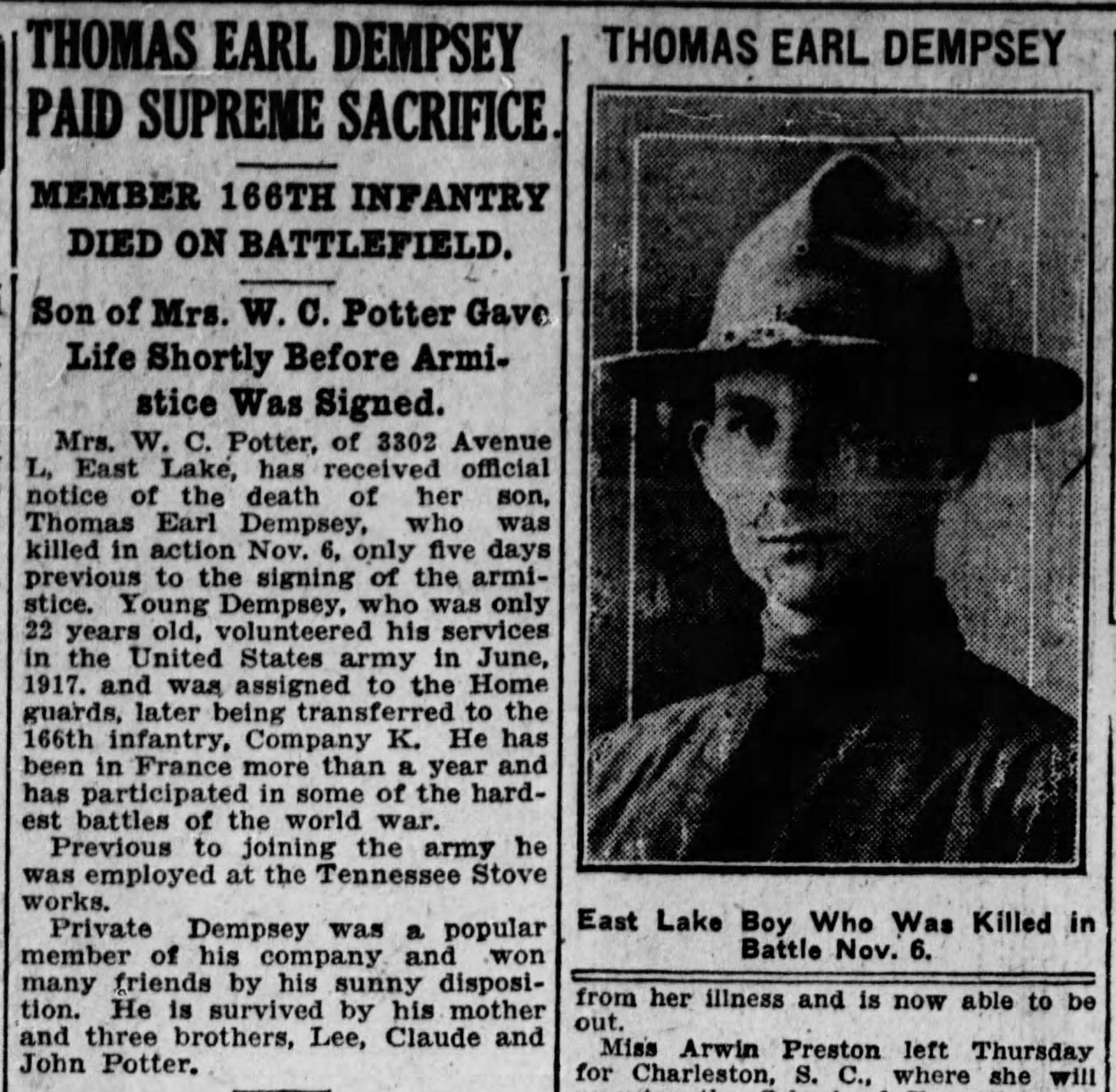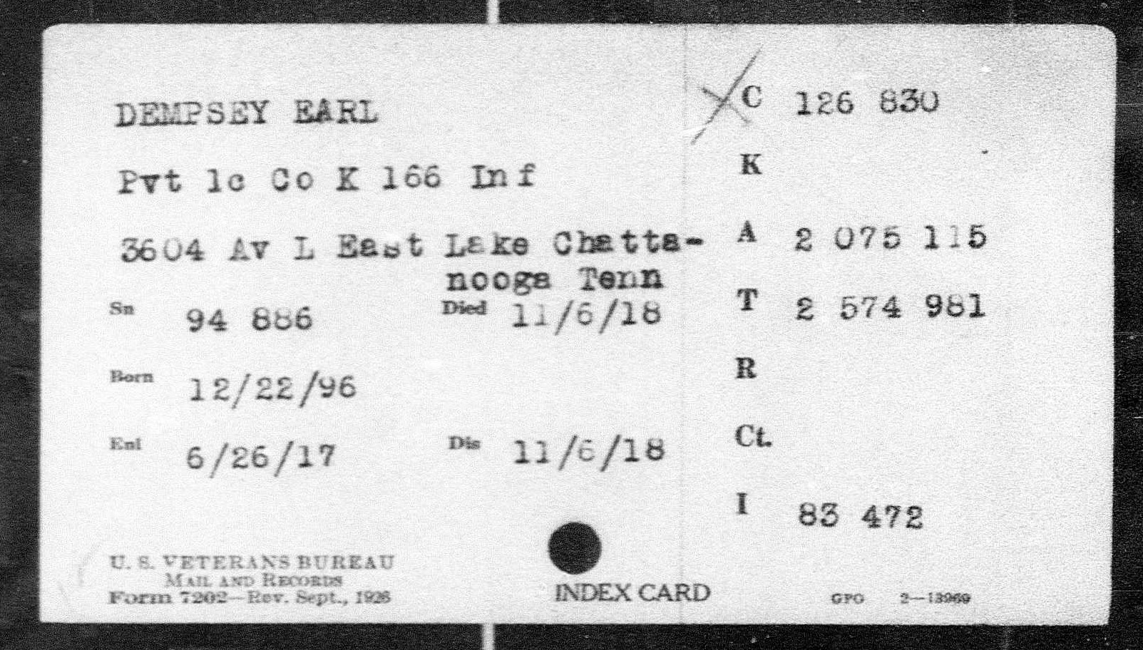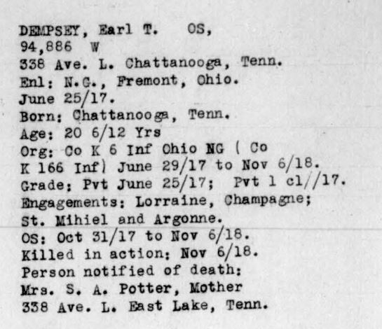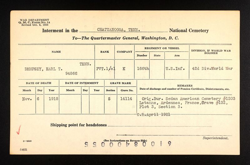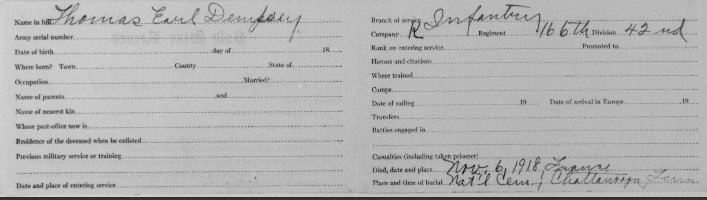 PFC Earl Thomas Dempsey was born in Chattanooga, Tennessee, around 1898, the son of Susie Crumby. His brothers included Claude and Lee Crumby and John Dempsey. PFC Dempsey served in the United States Army in World War I with Co. K, 166th Infantry, 42nd Division. He died of wounds received in action in France on November 6, 1918 at the age of 20. PFC Dempsey was initially buried at Sedan American Cemetery, Letanne, Ardennes, France, Grave 132, Plot 3, Section 3