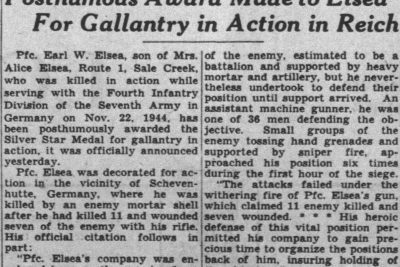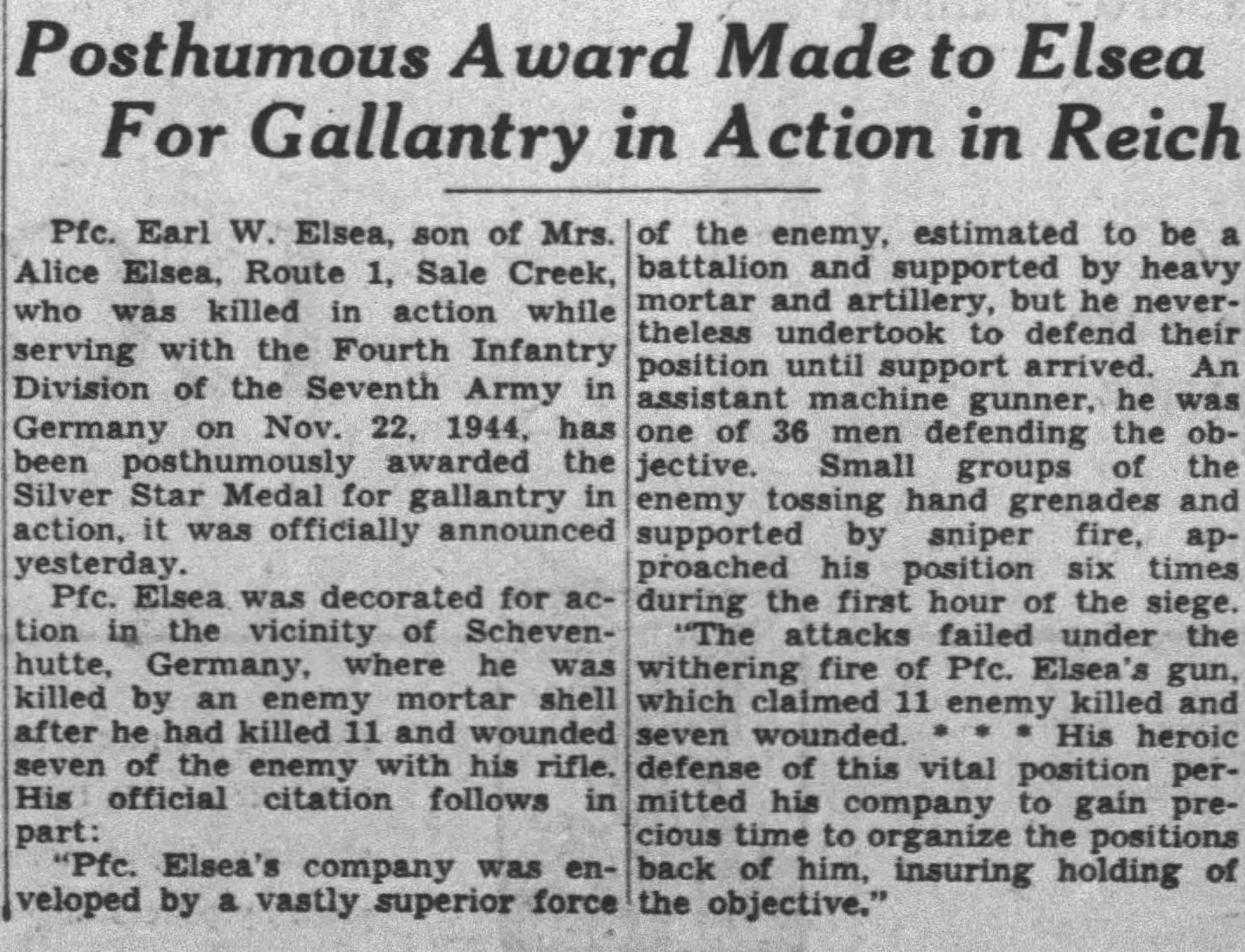 Pfc. Earl W. Elsea, son of Mrs. Alice Elsea, Route 1, Sale Creek, who was killed in action while serving with the Fourth Infantry Division of the Seventh Army in Germany on Nov. 22, 1944, has been posthumously awarded the Silver Star Medal for gallantry in action, it was officially announced yesterday. Pfc. Elsea was decorated for action in the vicinity of Schevenhutte, Germany, where he was killed by an enemy mortar shell after he had killed eleven and wounded seven of the enemy with his rifle. His official citation follows in part: “Pfc. Elsea’s company was enveloped by a vastly superior force of the enemy, estimated to be a battalion and supported by heavy mortar and artillery, but he nevertheless undertook to defend their position until support arrived. An assistant machine gunner, he was one of 36 men defending the objective. Small groups of the enemy, tossing hand grenades and supported by sniper fire, approached his position six times during the first hour of the siege. The attacks failed under the withering fire of Pfc. Elsea’s gun, which claimed 11 enemy killed and seven wounded. *** His heroic defense of this vital position permitted his company to gain precious time to organize the positions back of him, insuring holding of the objective.
