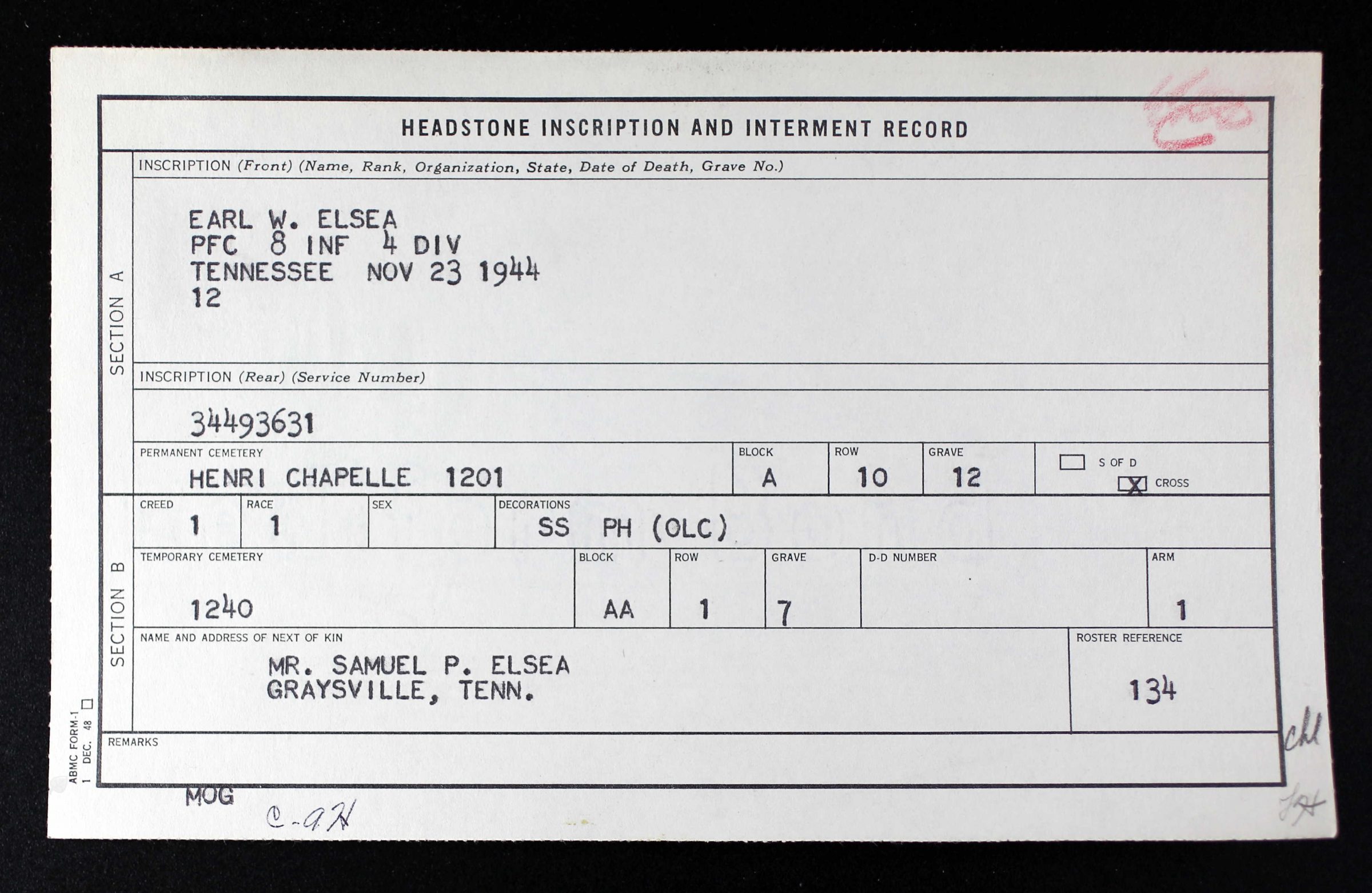 PFC Elsea was killed in action 23 November 1944. He is interred at A,10,12, Henri-Chapelle American Cemetery, Belgium.