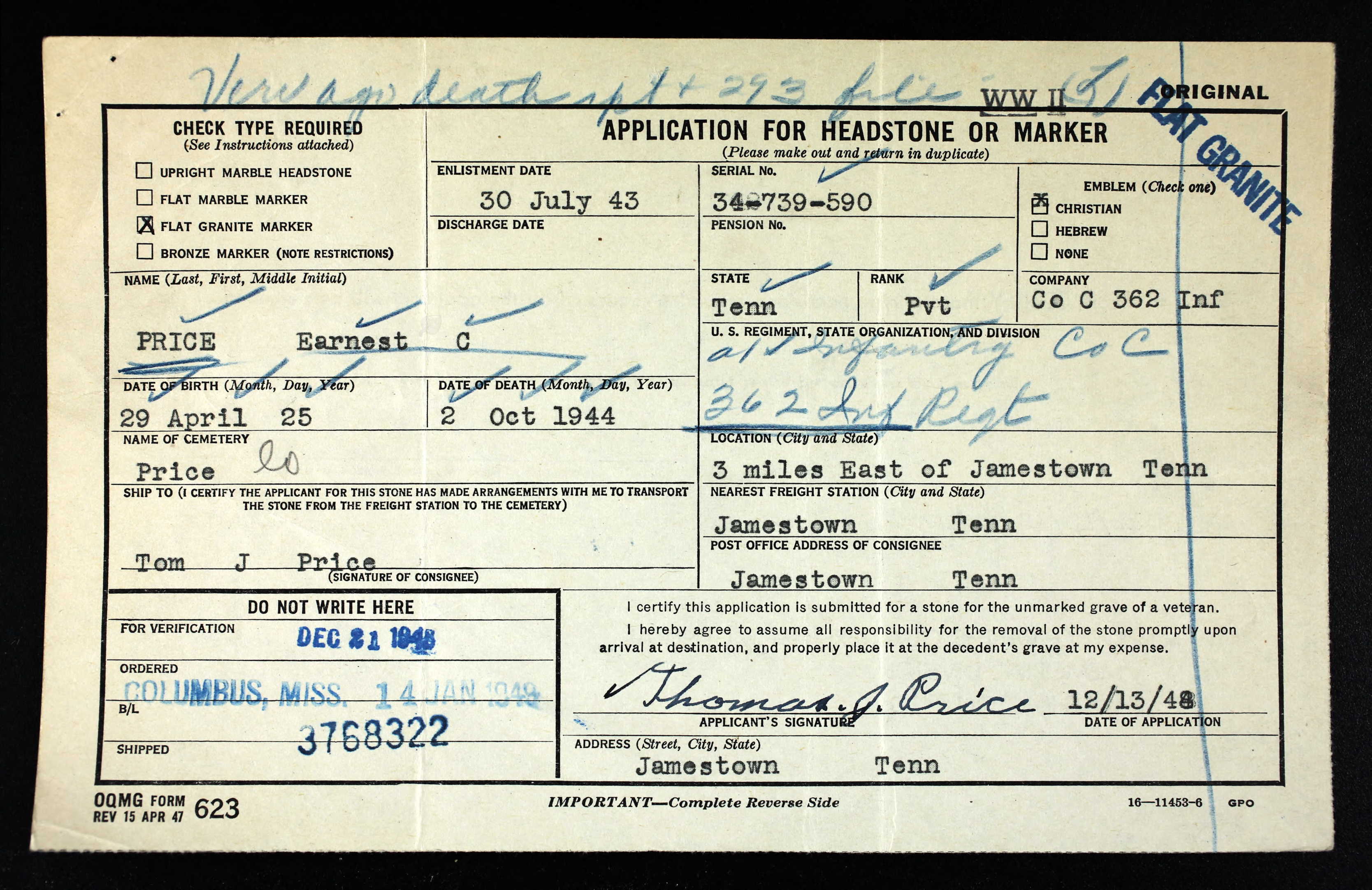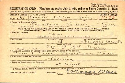 - Burial/Memorial Location: Price Cemetery, Jamestown, Fentress County, TN
