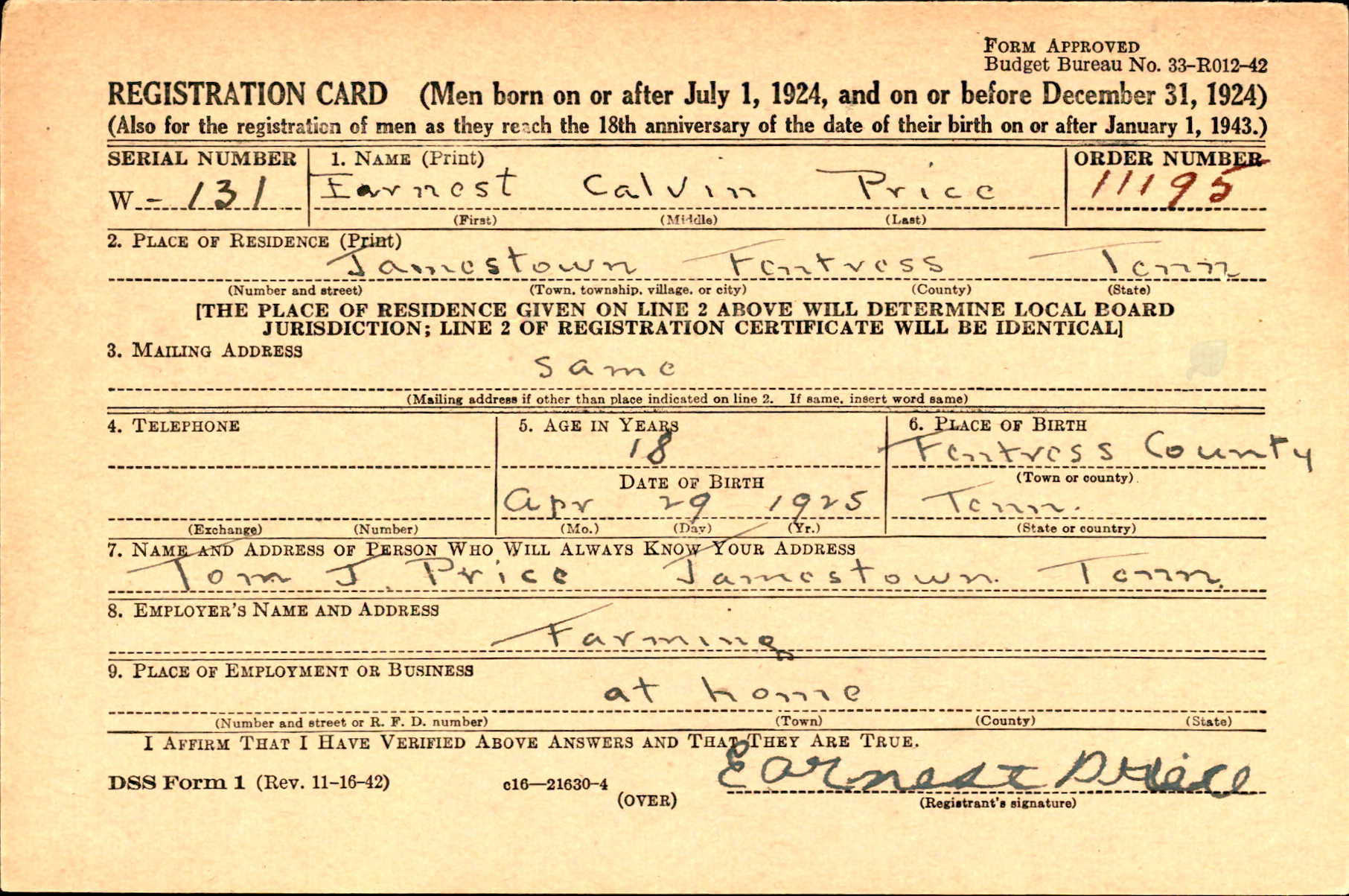 Earnest Calvin Price was born on 29 April 1925 to Thomas Jefferson Price and Arva Jane Manis.