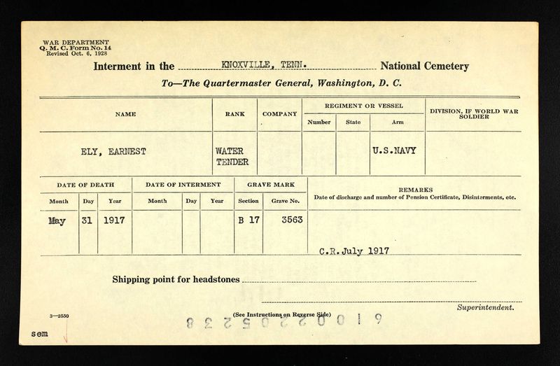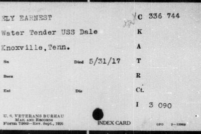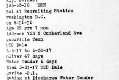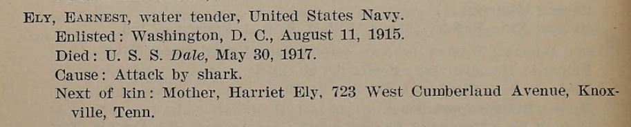 Earnest Ely enlisted in the U.S. Navy on August 1, 1907, at Knoxville. He was assigned to the torpedo boat USS Dale DD-4 after he had completed his preliminary sea training. He took part in the attack of our navy on Vera Cruz, Mexico. He lost his life May 31, 1917, when he was killed by a shark in Manila Bay. His body was recovered. He had received two medals. Was serving in third enlistment.