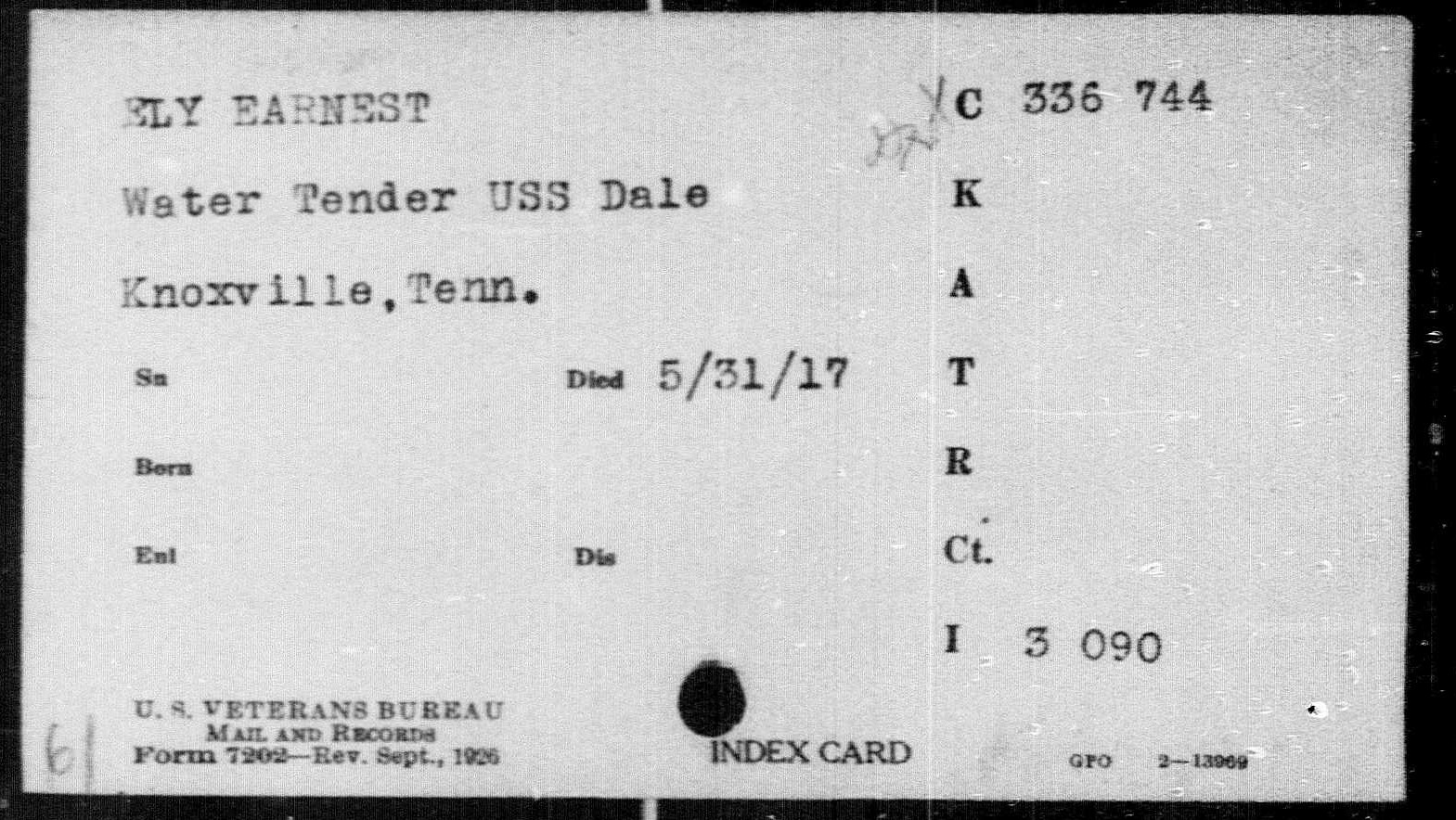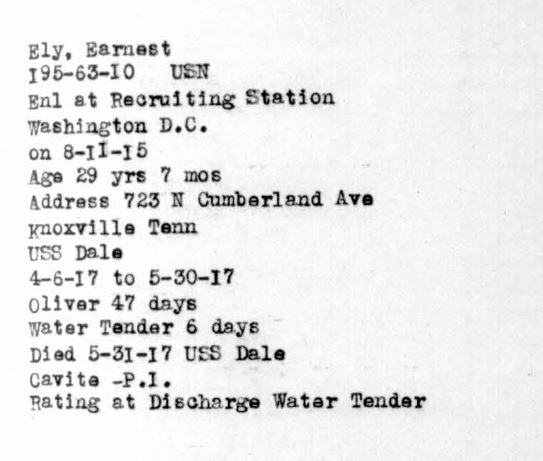 Earnest Ely enlisted in the U.S. Navy on August 1, 1907, at Knoxville. He was assigned to the torpedo boat USS Dale DD-4 after he had completed his preliminary sea training. He took part in the attack of our navy on Vera Cruz, Mexico. He lost his life May 31, 1917, when he was killed by a shark in Manila Bay. His body was recovered. He had received two medals. Was serving in third enlistment.