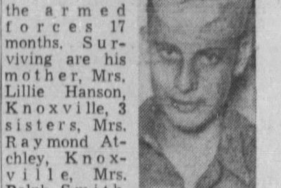 Surviving are his mother, Mrs. Lillie Hanson, Knoxville, 3 sisters, Mrs. Raymond Atchley, Knoxville, Mrs. Ralph Smith, Mount Olive, Mrs. Ralph Malone, Rockford, 2 brothers, Pfc. James M. Guantanamo Bay, Cuba and Cecil Edward Hanson, Knoxville.