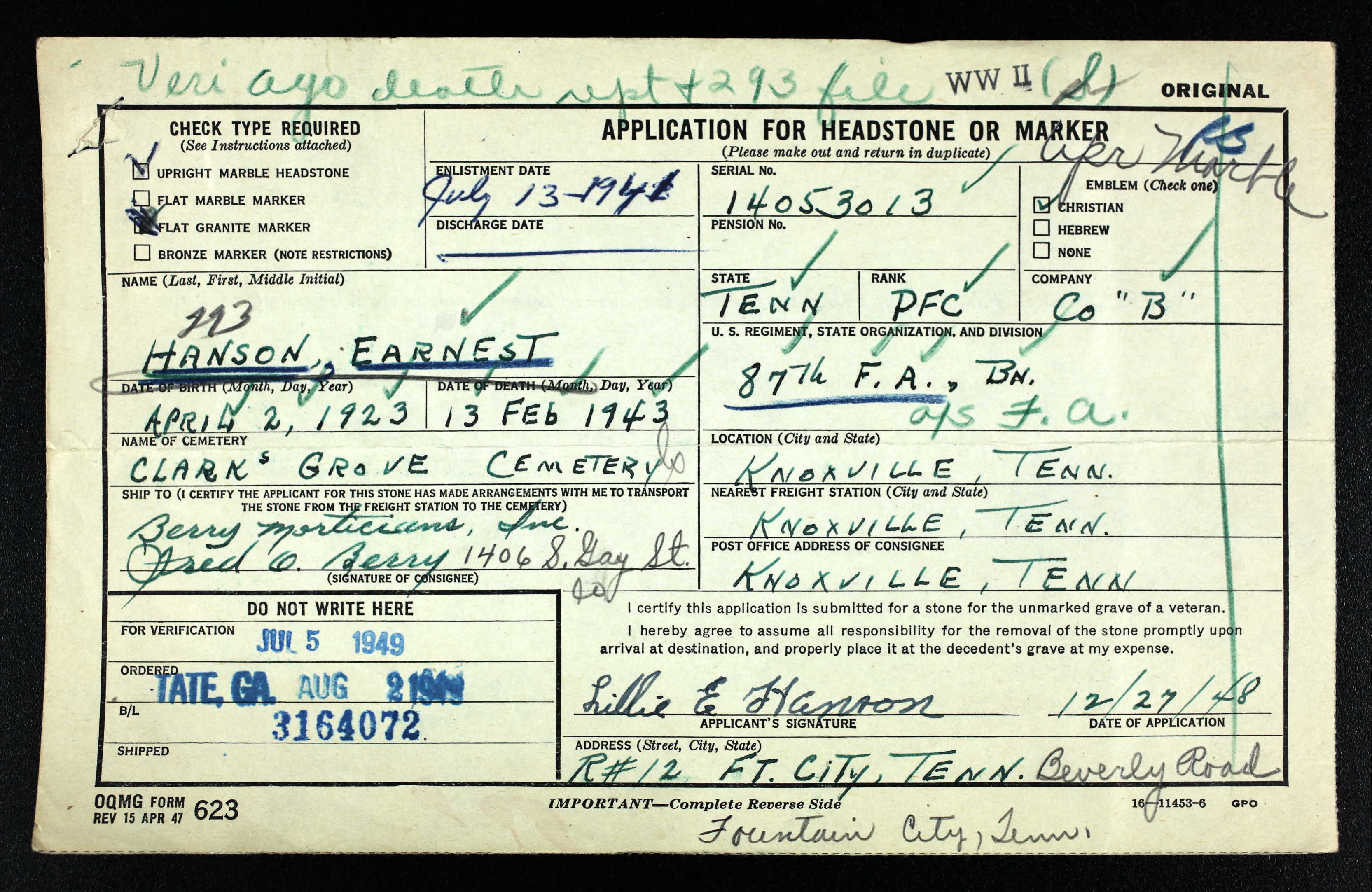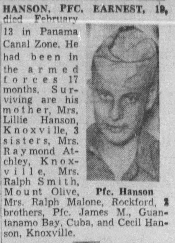 Private First Class Earnest Hanson, age 18, of Fountain City died in the Panama Canal Zone. He was repatriated back to the United States after the war and funeral services were held at Rockford Baptist Church on December 10, 1948, and burial in Clarks Grove Cemetery, Maryville, TN.