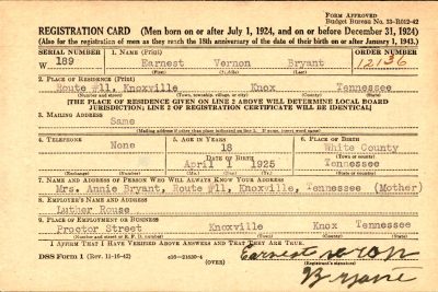 Earnest Vernon Bryant was born in White County, Tennessee, the son of Thomas Daniel Bryant and Anna belle Dabbs.