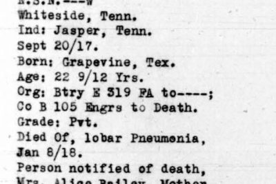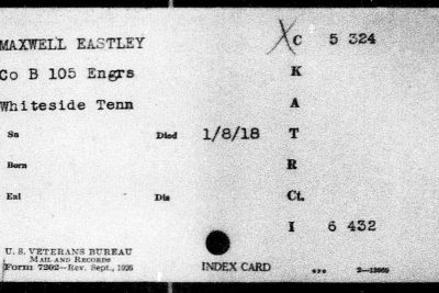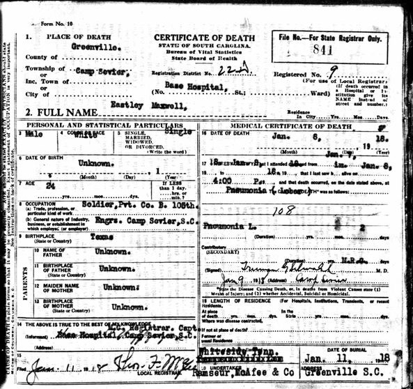 Pvt Maxwell was stationed at Camp Sevier in South Carolina. He died on 8 January 1918at the Base Hospital at Camp Sevier, Greenville County in South Carolina of Pneumonia.