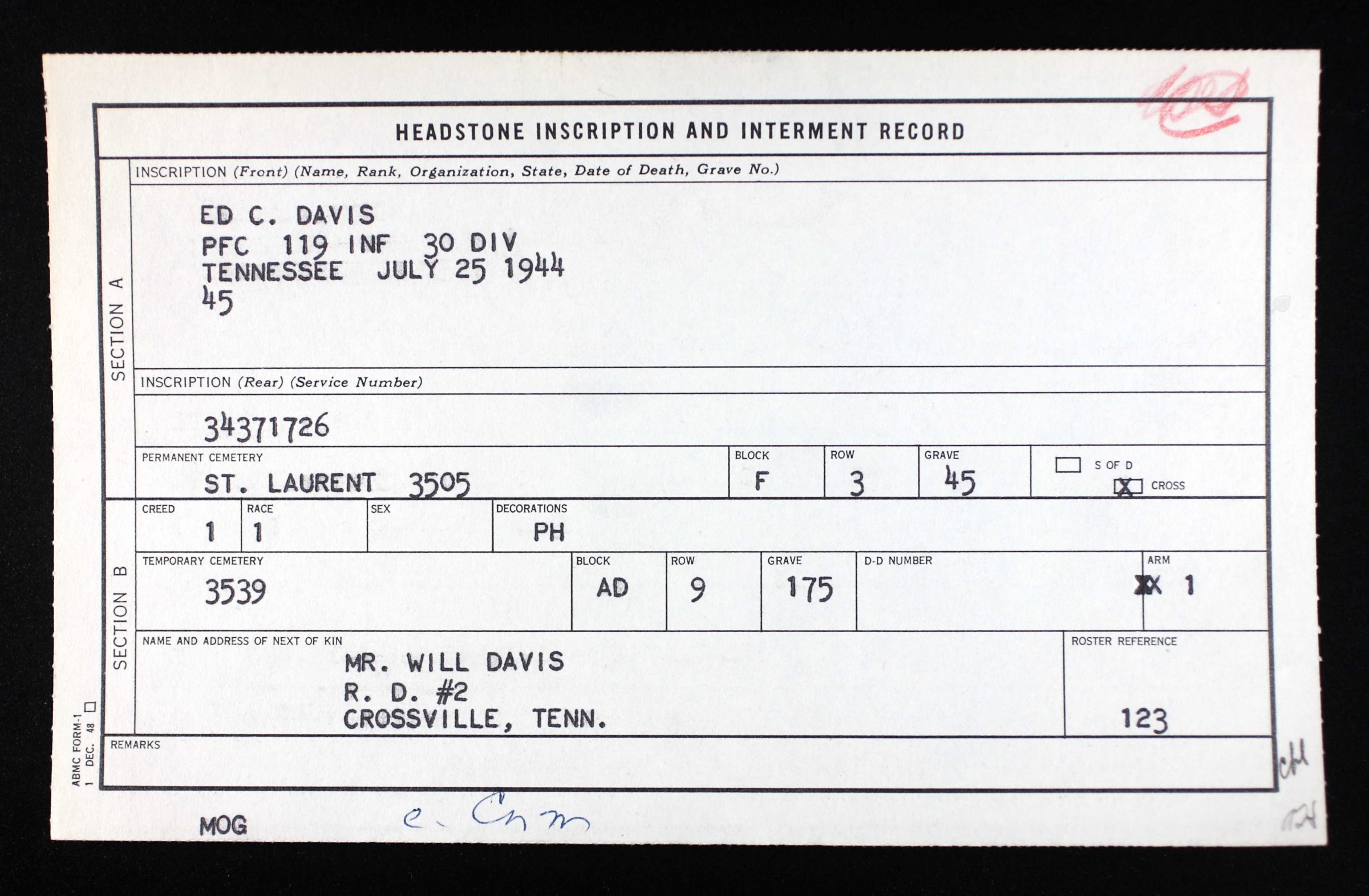 Private First Class Edward C. Davis was assigned to the 119th Infantry Regiment, 30th Infantry Division (Old Hickory). The unit was made up of National Guardsmen from North Carolina, South Carolina, Georgia, and Tennessee. The 30th Division went into Normandy across Omaha Beach on D-Day +5. It secured the Vire-et-Taute Canal and crossed the Vire river on 7 July 1944.