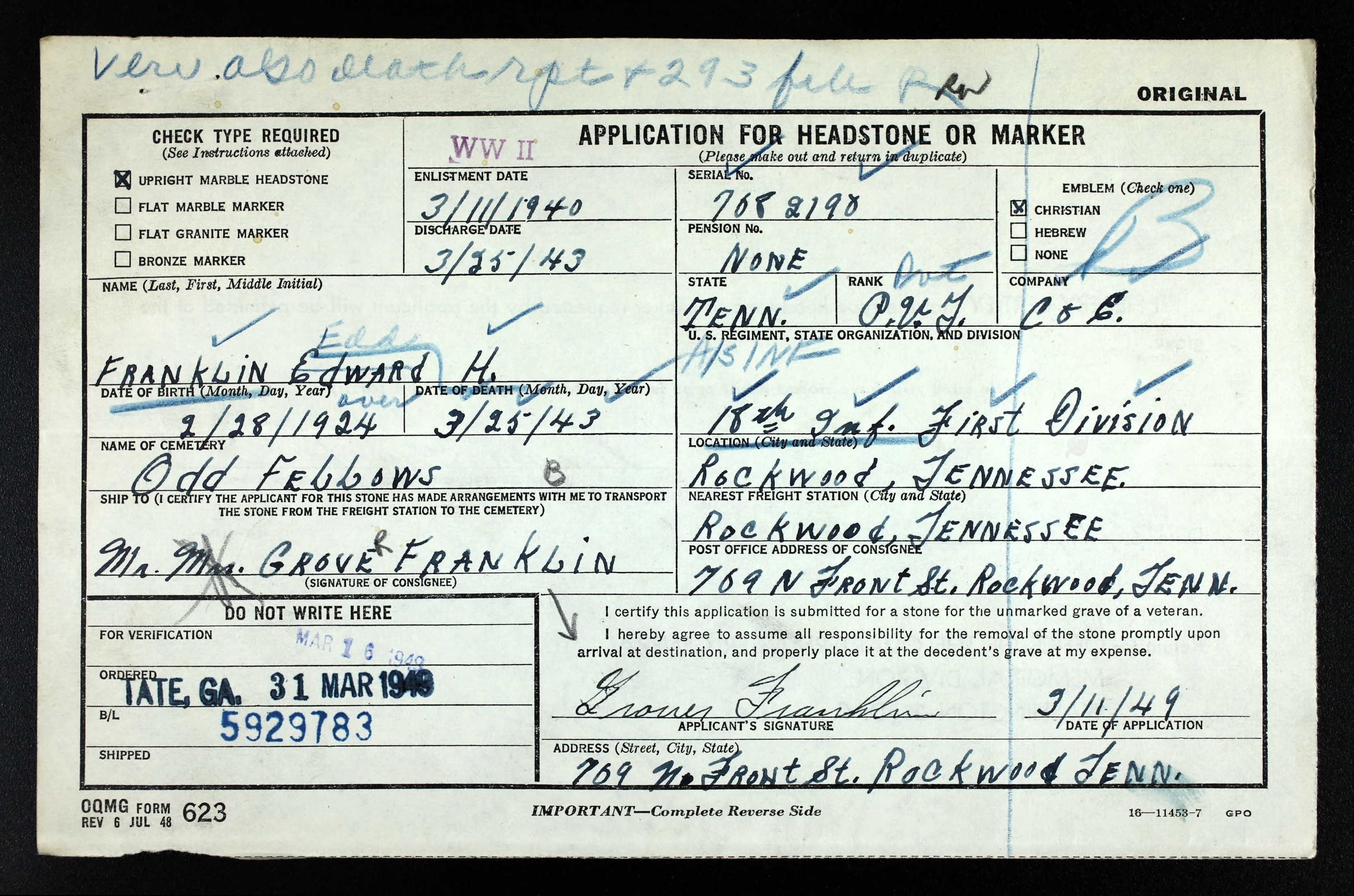 - Burial/Memorial Location: Odd Fellows Cemetery, Rockwood, Roane County, TN