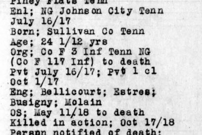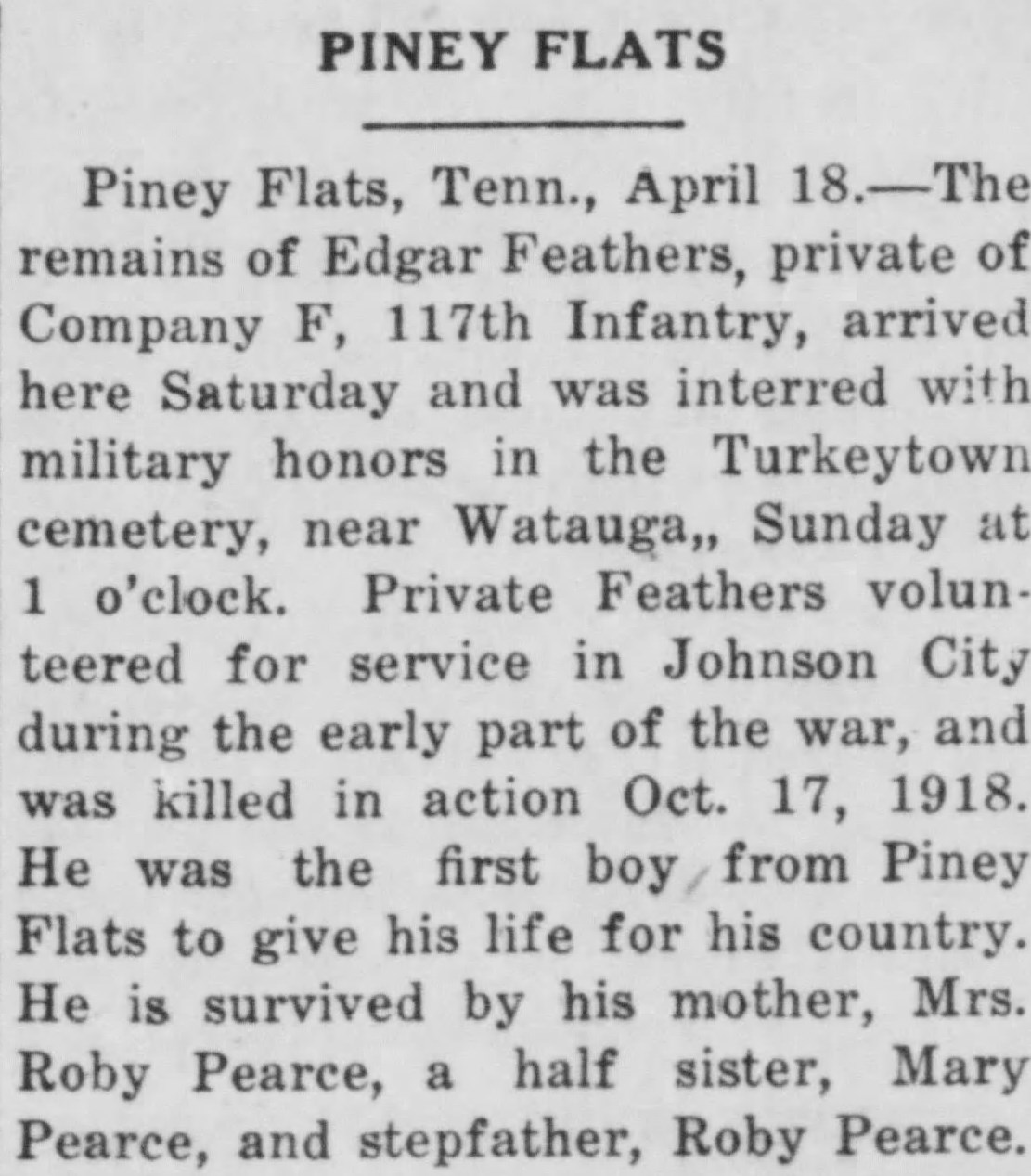 The remains of Edgar Feathers, private of Company F, 117th Infantry, arrived here Saturday and was interred with military honors in the Turkeytown Cemetery, near Watauga, Sunday at 1 o´clock. Private Feathers volunteered for service in Johnson City, during the early part of the war, and was killed in action, Oct 17, 1918.