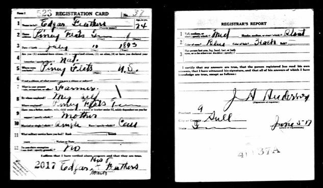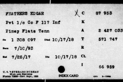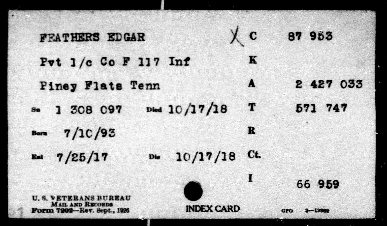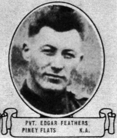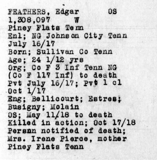 Edgar Feathers was born 10 July 1893, Piney Flats, Sullivan County, Tennessee to Robert Brown Pierce and Mary Catherine Irene Feathers. Pfc Feathers was killed in action on 17 October 1918.
