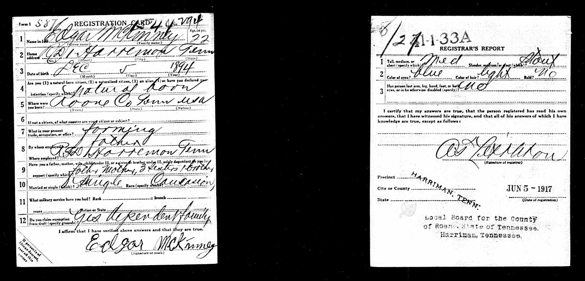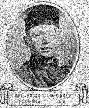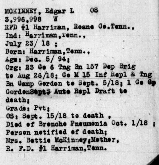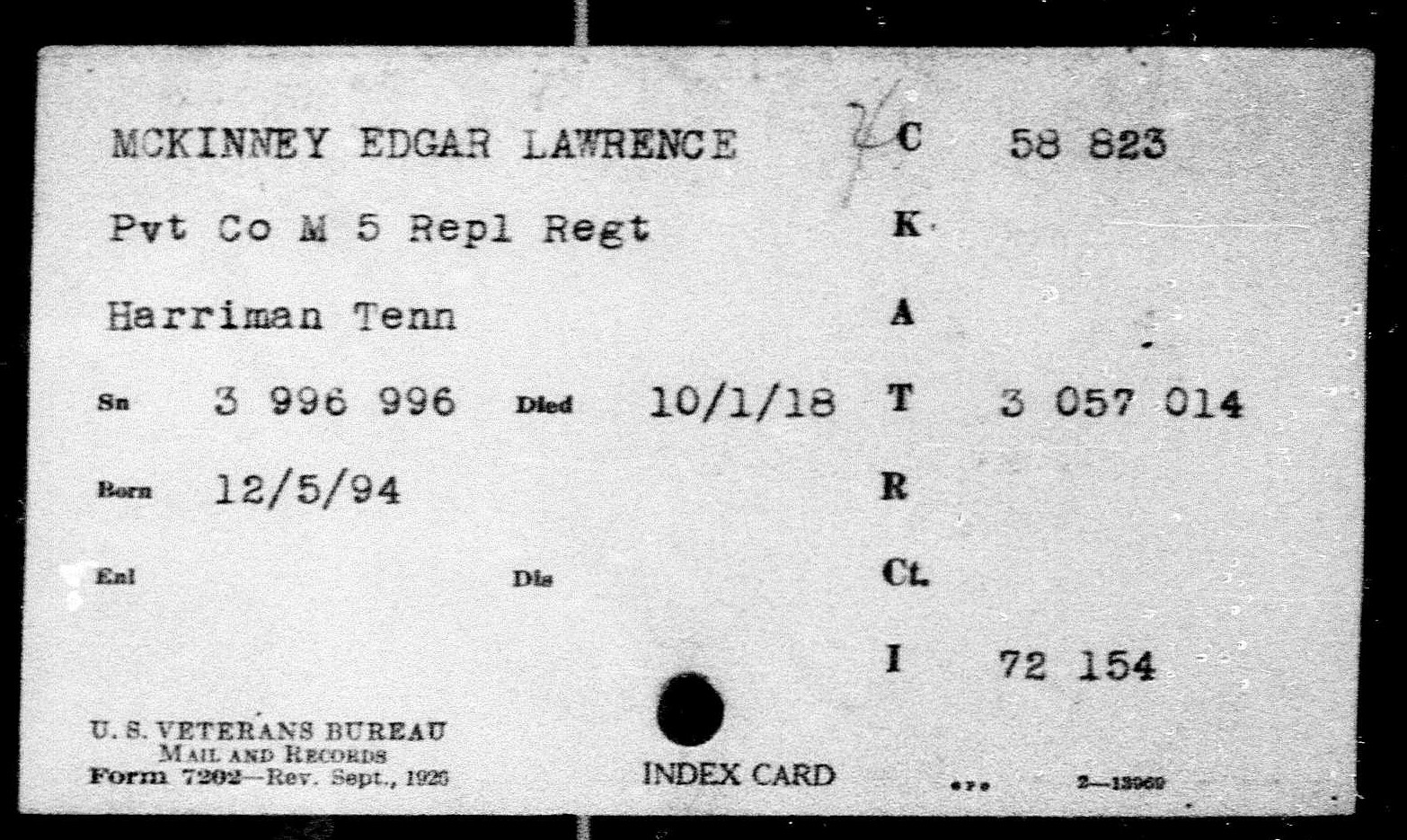 Edgar Lawrence McKinney was born in 1894 in Harriman, Tennessee to Joseph Anderson McKinney and Elizabeth “Bettie”Ann Cofer. He died on 1 October 1918 of Broncho Pneumonia.