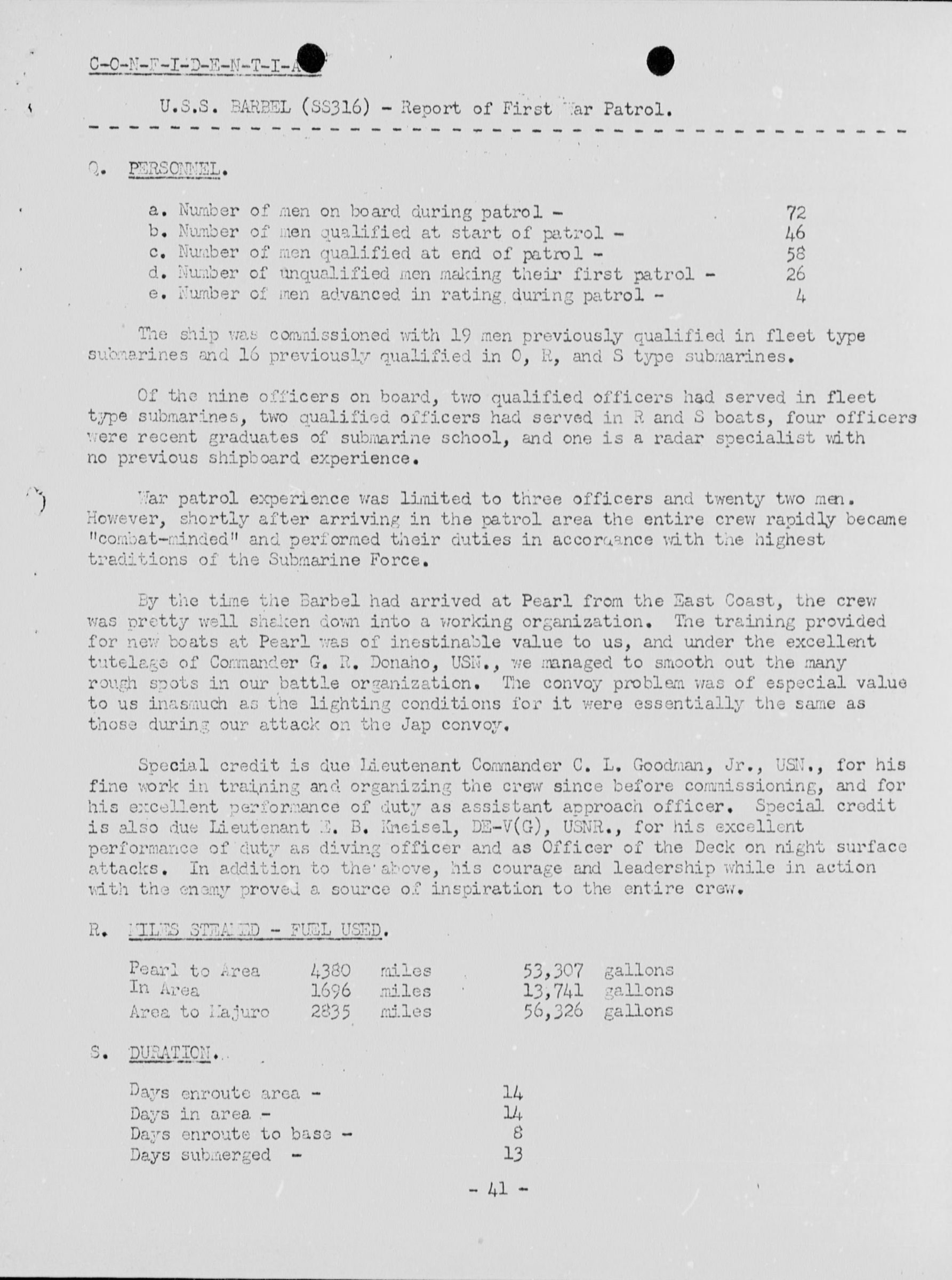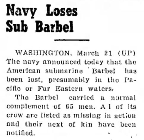 Lt Edmund Bixby Kneisel was assigned to the USS Barbel SS-316, a Balao-class submarine named for the barbell, a cyprinoid fish also known as a minnow or carp. The Barbel was commissioned on April 3, 1944 and in late January 1945 was ordered to patrol the western approaches to the Balabac Strait and the southern entrance to Palawan Passage. On 3 February, Barbel sent a message reporting that she had been attacked three times by enemy aircraft dropping depth charges and would transmit further information on the following night. Barbel was never heard from again. Japanese aviators reported an attack on a submarine off southwest Palawan on 4 February. Two bombs were dropped and one landed on the submarine near the bridge. The sub plunged, under a cloud of fire and spray. This was very likely the last engagement of Barbel. She was officially reported lost on 16 February 1945.