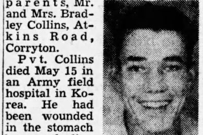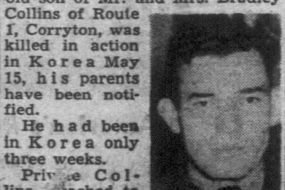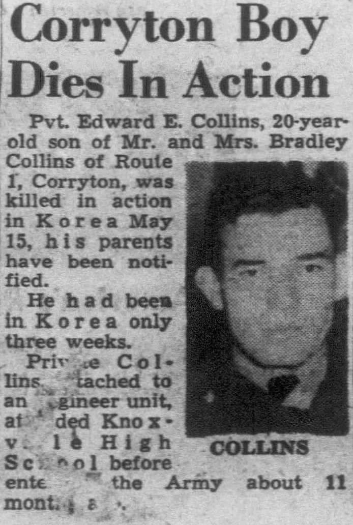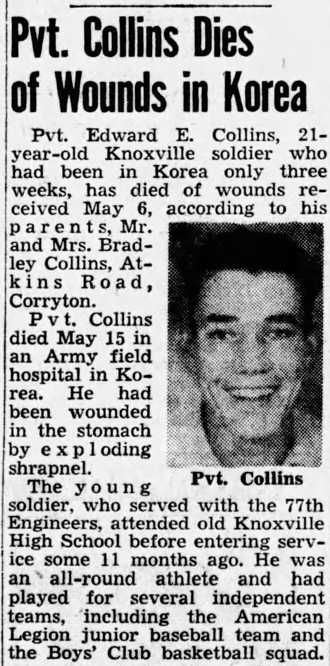 Pvt. Edward E. Collins, 21-yar-old Knoxville soldier who had been in Korea only three weeks, has died of wounds received May 6, according to his parents, Mr. and Mrs. Bradley Collins, Atkins Road, Corryton. Pvt. Collins died May 15 in an Army field hospital in Korea. He had been wounded in teh stomach by exploding shrapnel. The young soldier, who served with the 77th Engineers, attended old Knoxville High School before entering service some 11 months ago. He was an all-round athlete and had played for several independent teams, including the American Legion junior basketball team and the Boys’ Club basketball squad.