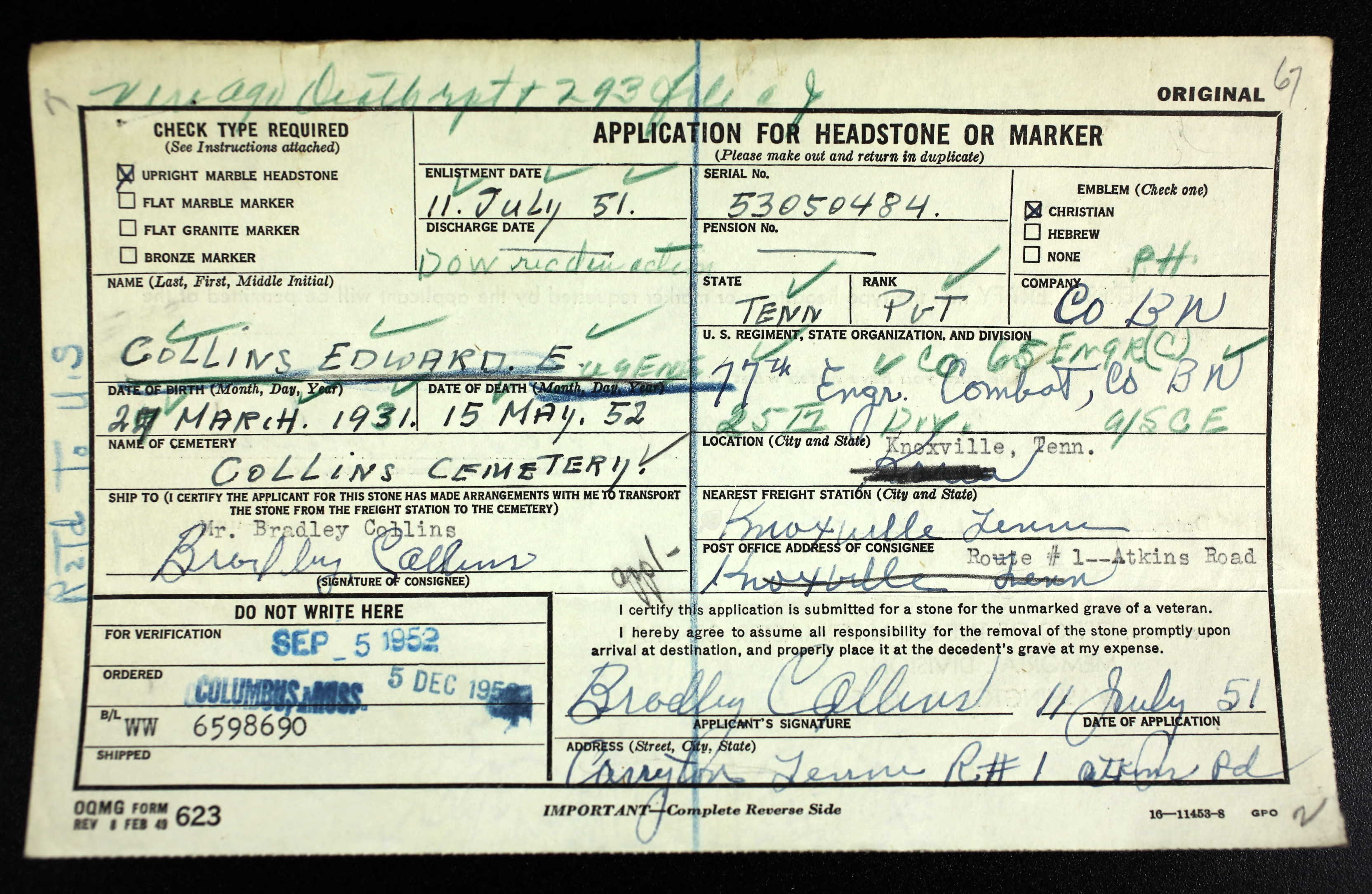 He was the son of Bradley and Mallie Ethel Roberts Collins. Edward was a member of Linden Avenue Baptist Church and attended Knoxville High School. Private Edward Eugene Collins entered the United States Army about June of 1951 and was assigned to the 77th Engineer Construction Company, 25th Infantry Division. He had been in the Army about eleven months when he was sent to Korea. He was only three weeks into his tour in Korea when he was seriously wounded while fighting the enemy in North Korea on May 6, 1952. He died of those wounds on May 15, 1952. In addition to his parents, he was survived by brother, James L. Collins sisters, Misses Laura and Wanda Collins grandparents, Mr. & Mrs. F.H. Collins of Corryton. Private Collins was awarded the Purple Heart, the Korean Service Medal, the United Nations Service Medal, the National Defense Service Medal, the Korean Presidential Unit Citation and the Republic of Korea War Service. Private Collins was buried at Collins Cemetery in Grainger County, TN.