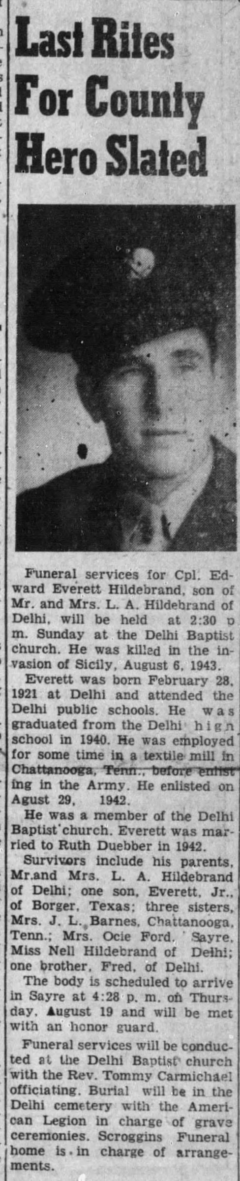 Funeral services for Cpl. Edward Everett Hildebrand, son of Mr. and Mrs. L.A. Hildebrand of Delhi, will be held at the Delhi Baptist Church. He was killed in the invasion of Sicily, August 6, 1943.