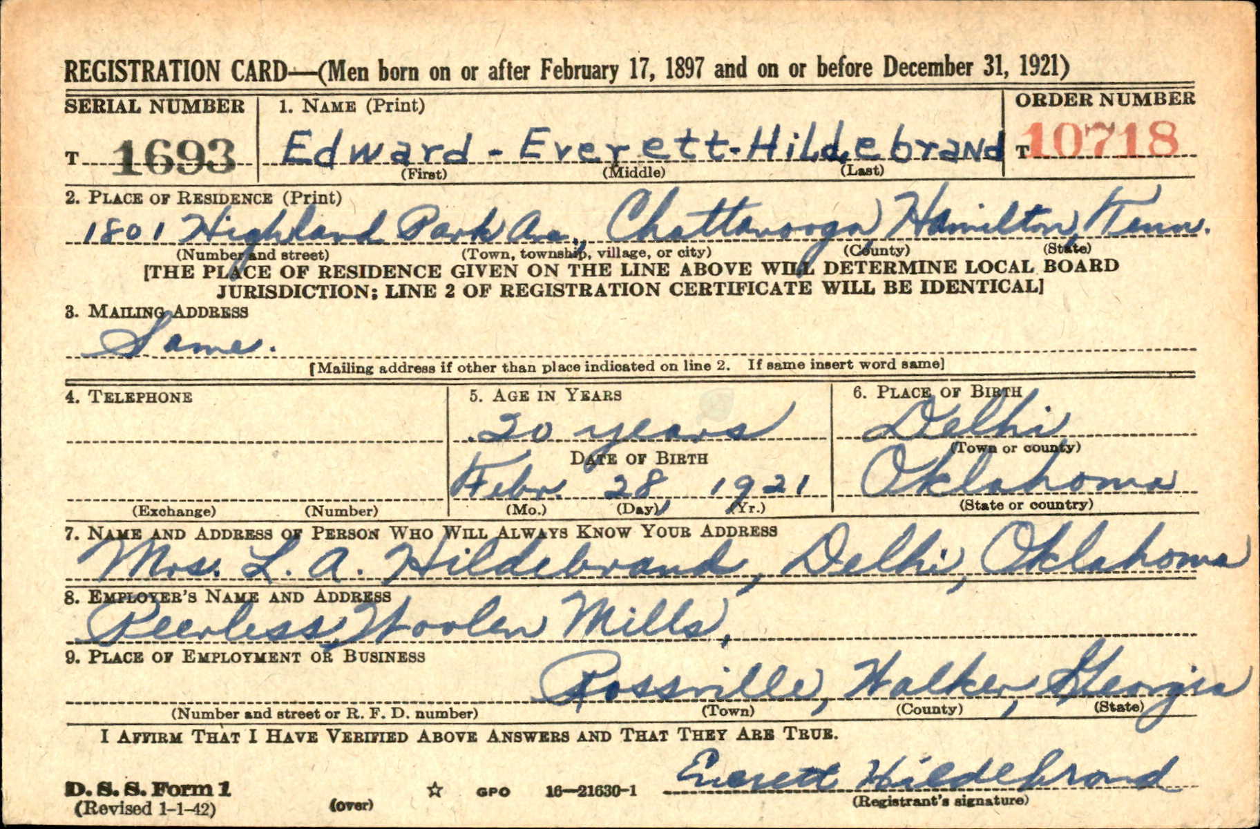 Everett was born February 28, 1921 at Delhi and attended the Delhi public schools. He was graduated from the Delhi High School in 1940. He was employed fors ome time in a textile mill in Chattanooga, Tenn., before enlisting in the Army. He enlisted on August 29, 1942.