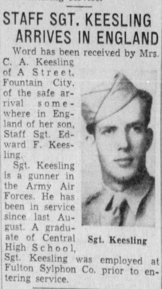 Word has been received by Mrs. C.A. Keesling of A Street, Fountain City, of the safe arrival somewhere in England of her son, Staff Sgt. Edward F. Keesling. Sgt. Keesling is a gunner in the Army Air Forces. He has been in service since last August. A graduate of Central High School, Sgt. Keesling was employed at Fulton Sylphon Co. prior to entering service.