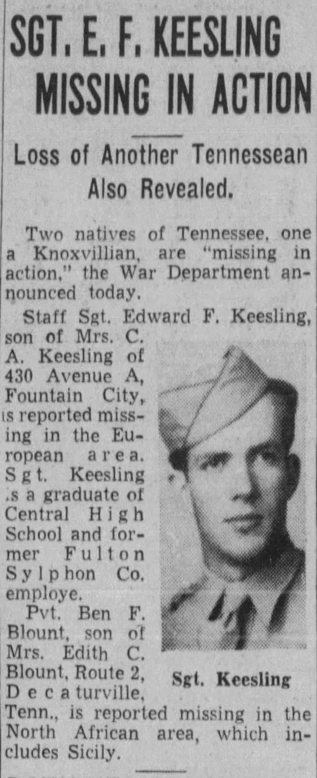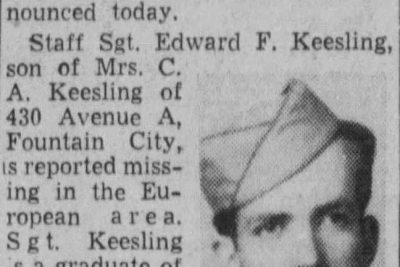 Staff Sgt. Edward F. Keesling, son of Mrs. C.A. Keesling of 430 Avenue A, Fountain City, is reported missing in the European area.